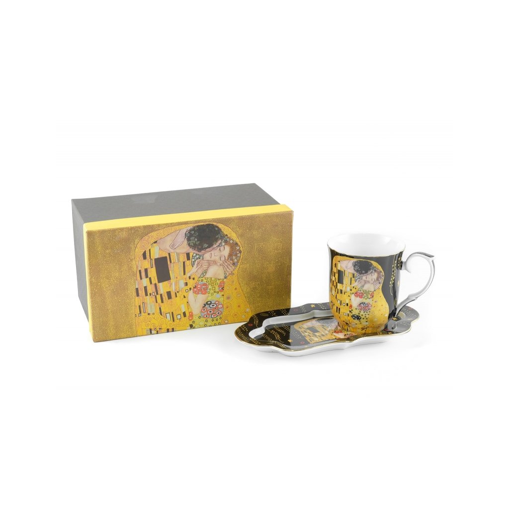 Porcelán bögre kb. 360 ml űrtartalommal Gustav Klimt A csók című művének dekorációjával, valamint egy nagyobb, azonos kialakítású alátéttel. A praktikus alátétet nagyra fogja értékelni a tálalás során, használhatja vendéglátásra, desszertre, uzsonnára vagy gyümölcsre. Szép csomagolásban díszdobozban, nem kell aggódnia a csomagolás miatt, ha ajándékba szeretné adni.