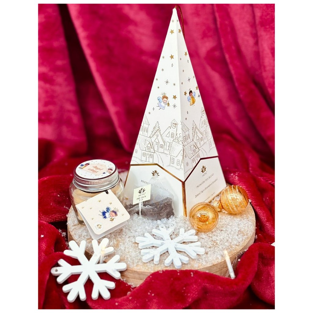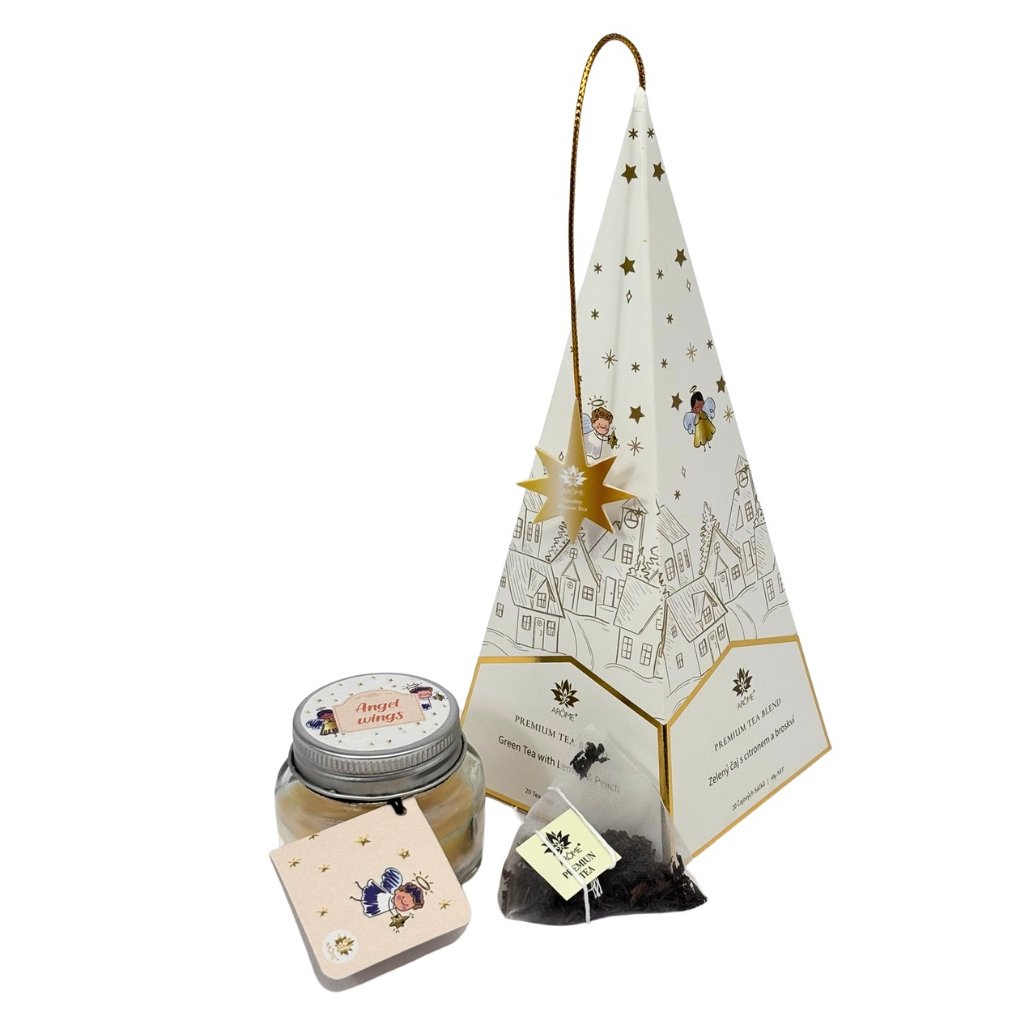 Ez az ajándékkészlet remek ajándékötlet minden tea- és kényelemszerető számára. Ízesített zöld teát, kellemes illatú gyertyát és egy címkét tartalmaz, amelyre személyes üzenetet írhat. A karácsonyi motívumokkal ellátott díszdoboznak köszönhetően a készlet azonnal ajándékozásra kész.