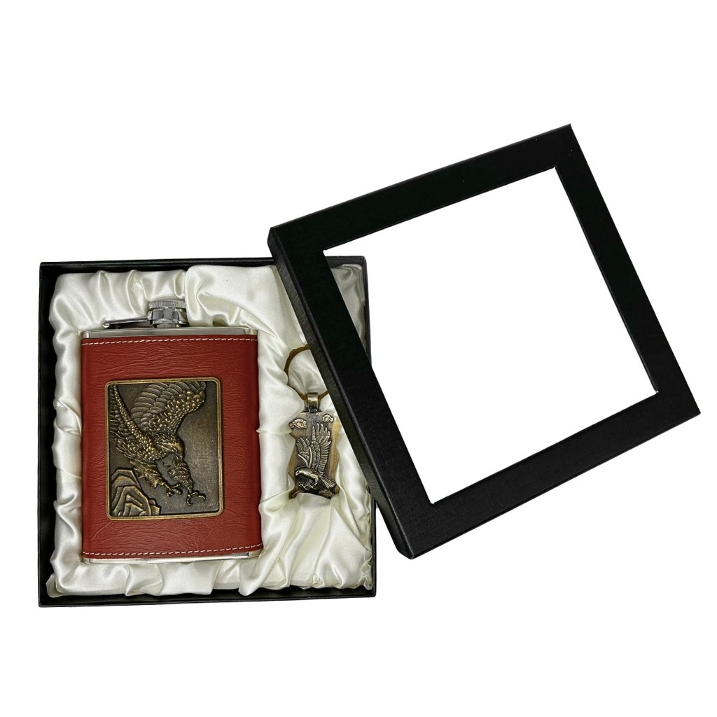 Ajándékkészlet rozsdamentes acél laposüveggel és kulcstartóval. Repülő sassal díszítve.