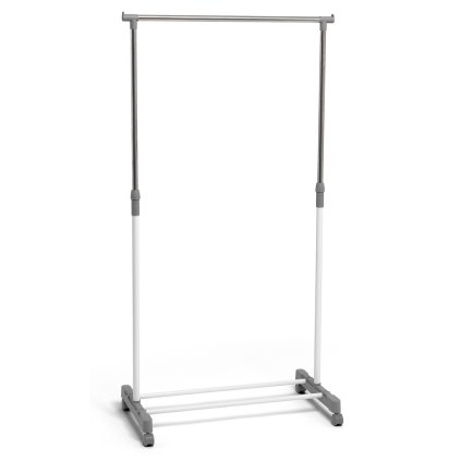 Állítható magasságú ruhatartó integrált polccal és forgó kerekekkel. Méretek 75 x 42 x 90-160v cm, fehér és szürke színben. Ultra könnyű és kompakt.