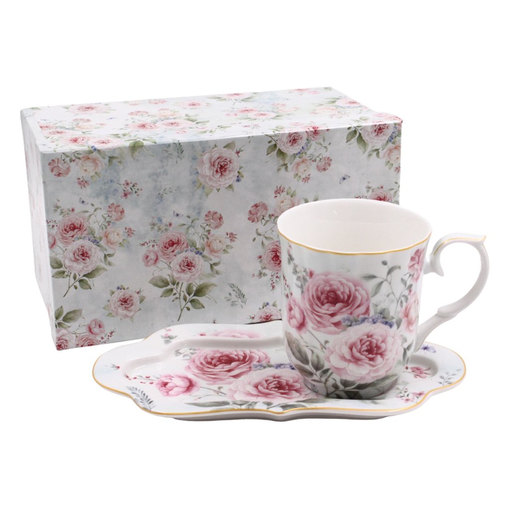 Porcelán bögre kb. 360 ml űrtartalommal finoman díszített rózsavirágokkal valamint egy nagyobb alátét ugyanabban a kivitelben. A praktikus alátétet nagyra értékeli a tálalás során, használhatja vendéglátásra, desszertre, uzsonnára vagy gyümölcsre. Szép csomagolásban díszdobozban, nem kell aggódnia a csomagolás miatt, ha ajándékba szeretné adni.