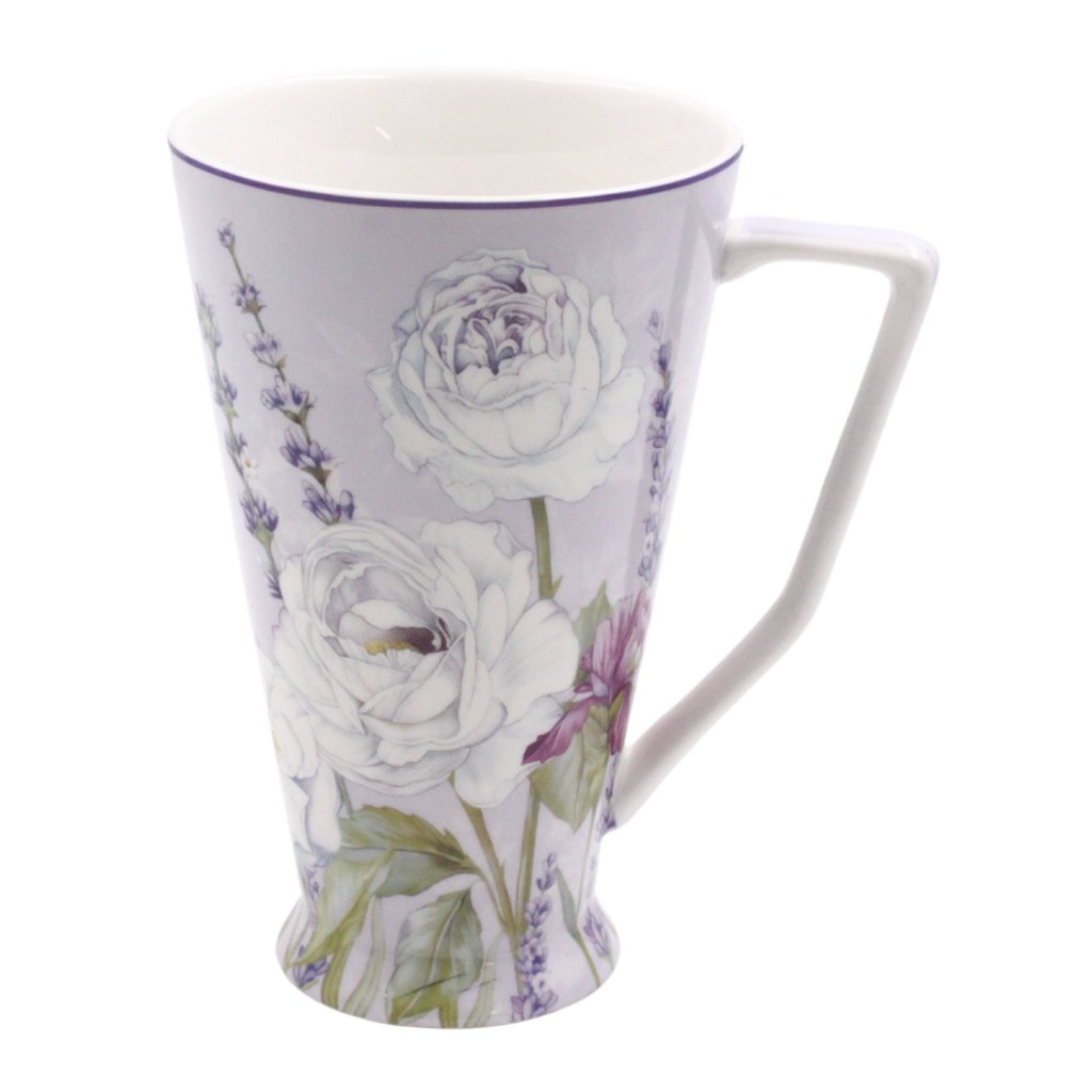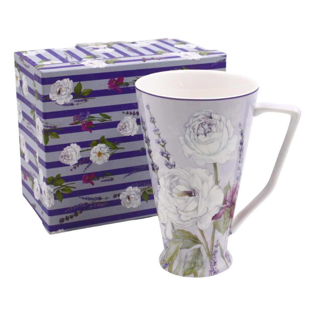 Finom levendula dekoráció egy magas porcelán bögrén, mely eredeti formájú és gyönyörű díszdobozba van csomagolva. A bögre kiválóan alkalmas teához, forralt borhoz, bécsi kávéhoz vagy akár forró csokoládéhoz.