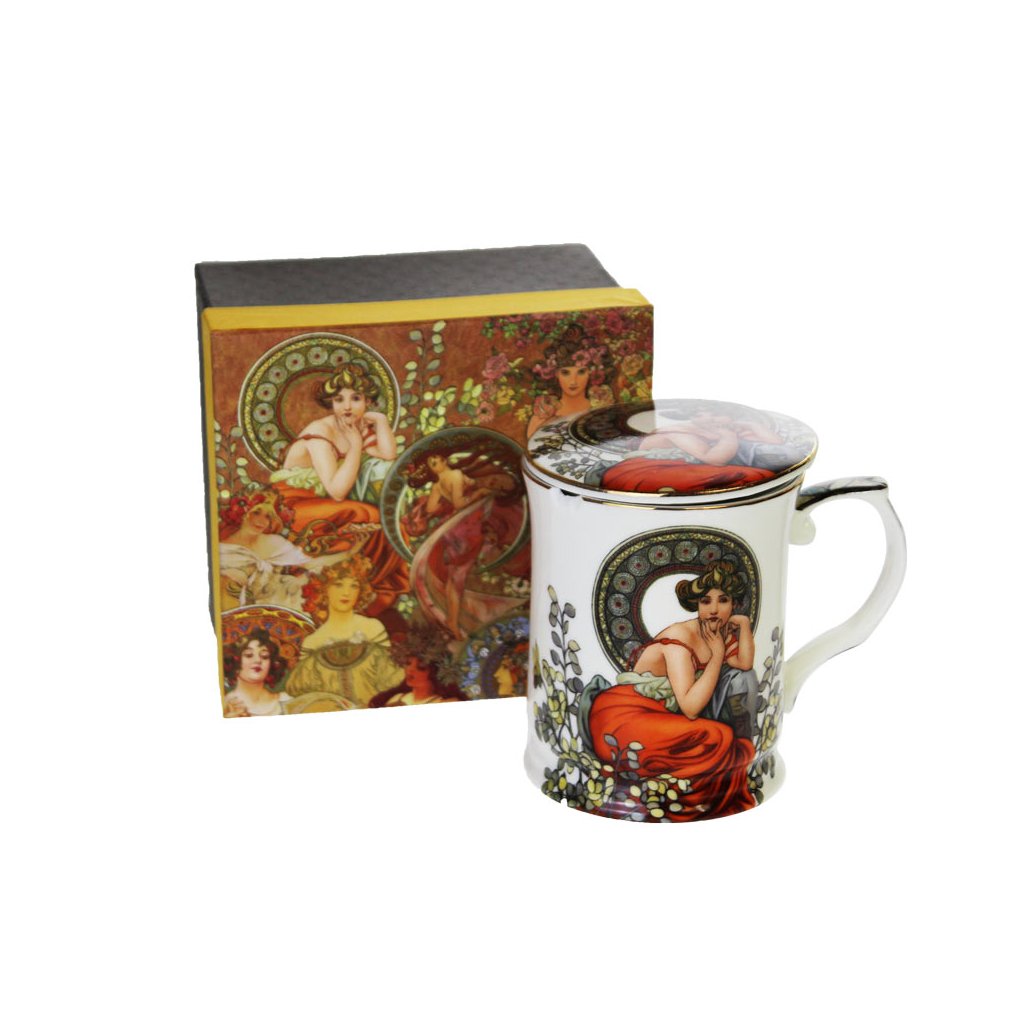 Nagyobb, 400 ml-es porcelánbögre szűrővel és fedővel gyógy- és szálas teák készítéséhez.Örömet okoz Alfons Mucha alkotásának gyönyörű, ízléses dekorációjával. A rozsdamentes acél szűrő lehetővé teszi a szálas tea közvetlenül a bögrében történő elkészítését. Egyszerűen tegye a tealeveleket a szűrőbe, öntse fel forró vízzel, és hagyja ázni az Ön preferenciái szerint. A bögre fedele biztosítja, hogy a tea meleg és aromás maradjon.