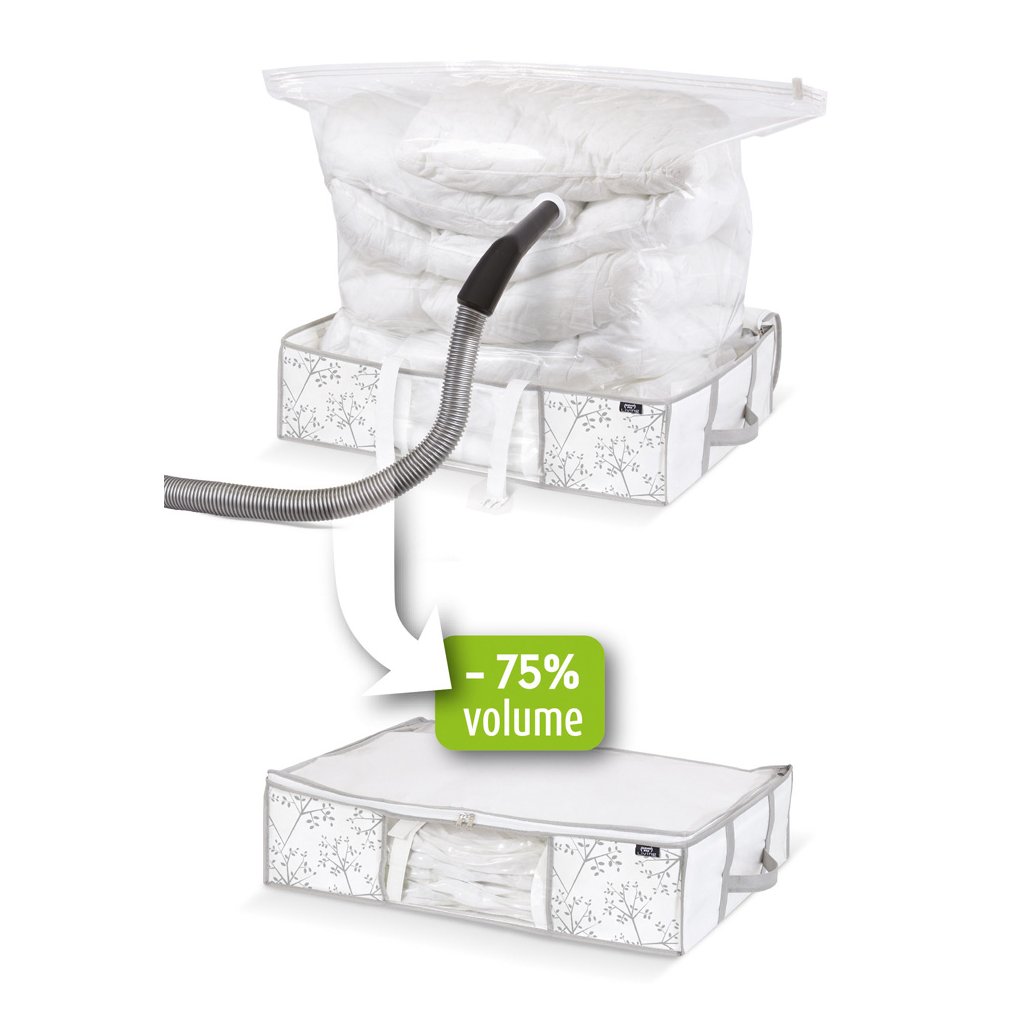A tárolódoboz a belsejében lévő vákuumzsákkal nagyszerű eszköz a nagytakarításhoz és a kicsit tömöttebb szekrényekhez. A vendégeknek szánt ágyneműt vagy a szezonális ruhákat, amelyek sok helyet foglalnak a szekrényben könnyen bepakolhatja a zsákba, amelyből a porszívóval kiszívja az összes levegőt, és lezárja a szelepet. A tartalom így 75%-kal csökken!A doboz praktikus felső zárással rendelkezik cipzárral. A kezelését a oldalsó fülek könnyítik meg.