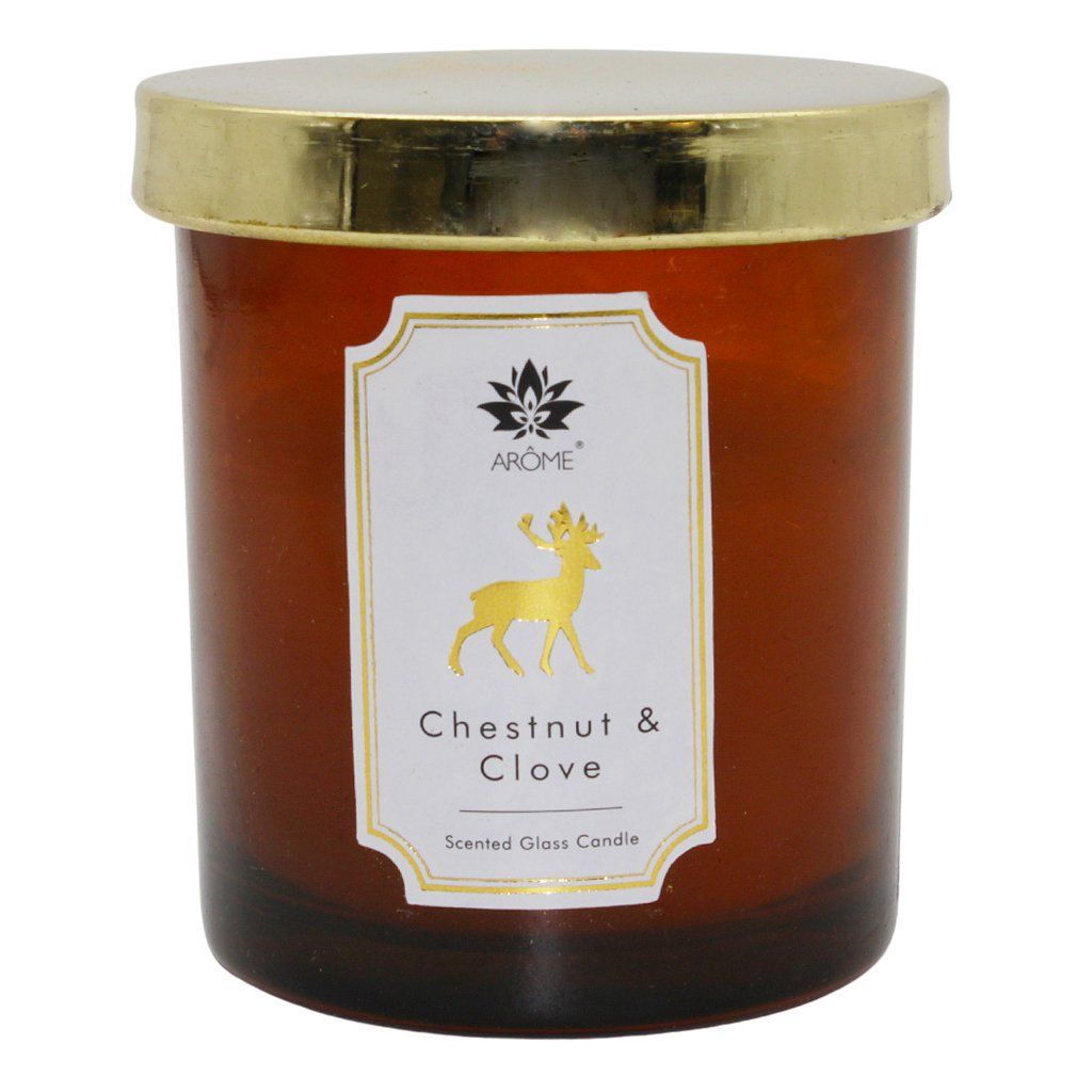 A barna üvegben, arany fedővel ellátott karácsonyi illatgyertya a karácsonyi asztal dísze lesz. Az őszi gesztenyeillat a szegfűszeg melengető illatával harmóniát és nyugalmat visz otthonába.