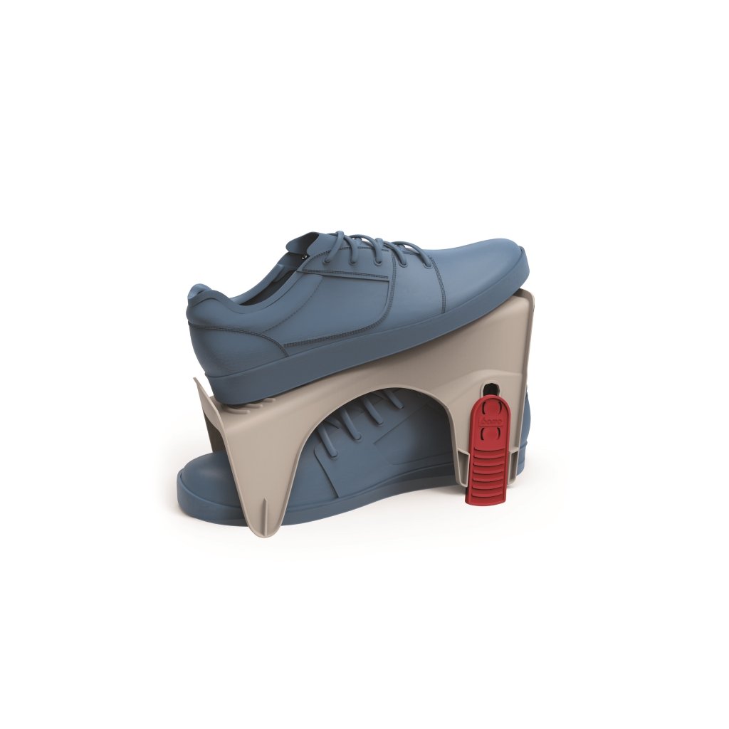 Az egyik cipőt az alsó részbe, a másikat a felső részbe helyezi. A műanyag cipőszervező állítható magasságú, alkalmas pumpákhoz, papucsokhoz és teli cipőkhöz is. Szilárd szerkezettel és csúszásgátló felülettel rendelkezik.