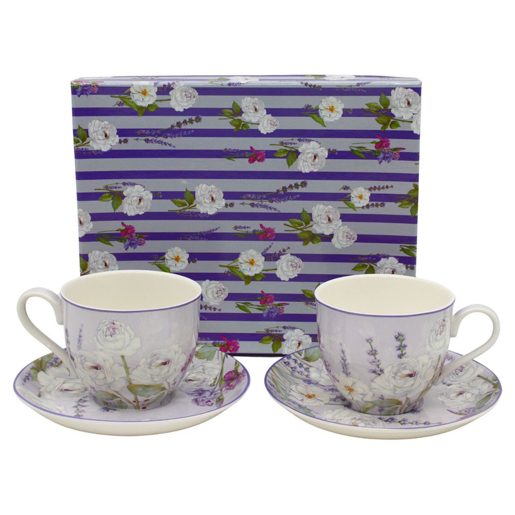 Elegáns, kiváló minőségű, vékony porcelán készlet finom, levendulás virágmintával. A készlet két porcelán csészéből és alátétből áll.