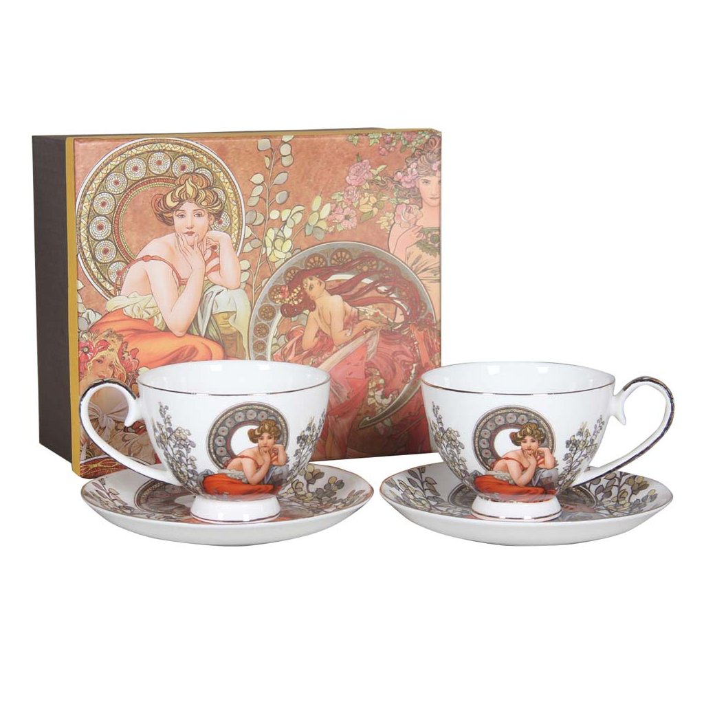 Exkluzív, kiváló minőségű, vékony porcelán készlet "New bone" a híres cseh festő, Alphonse Mucha lenyűgöző alkotásának másolatával. A készlet két porcelán csészéből és alátétből áll, és díszdobozba van csomagolva.