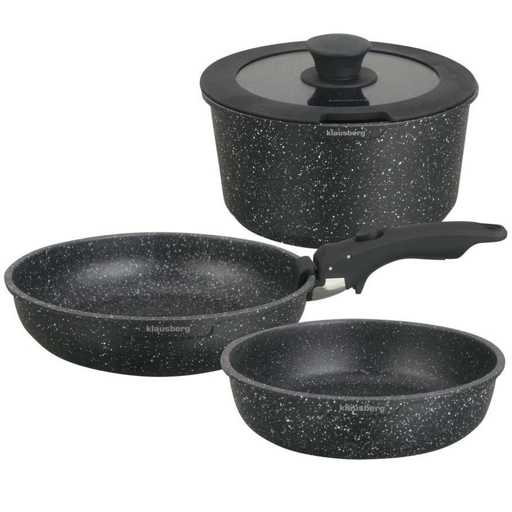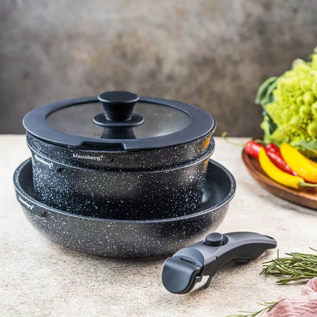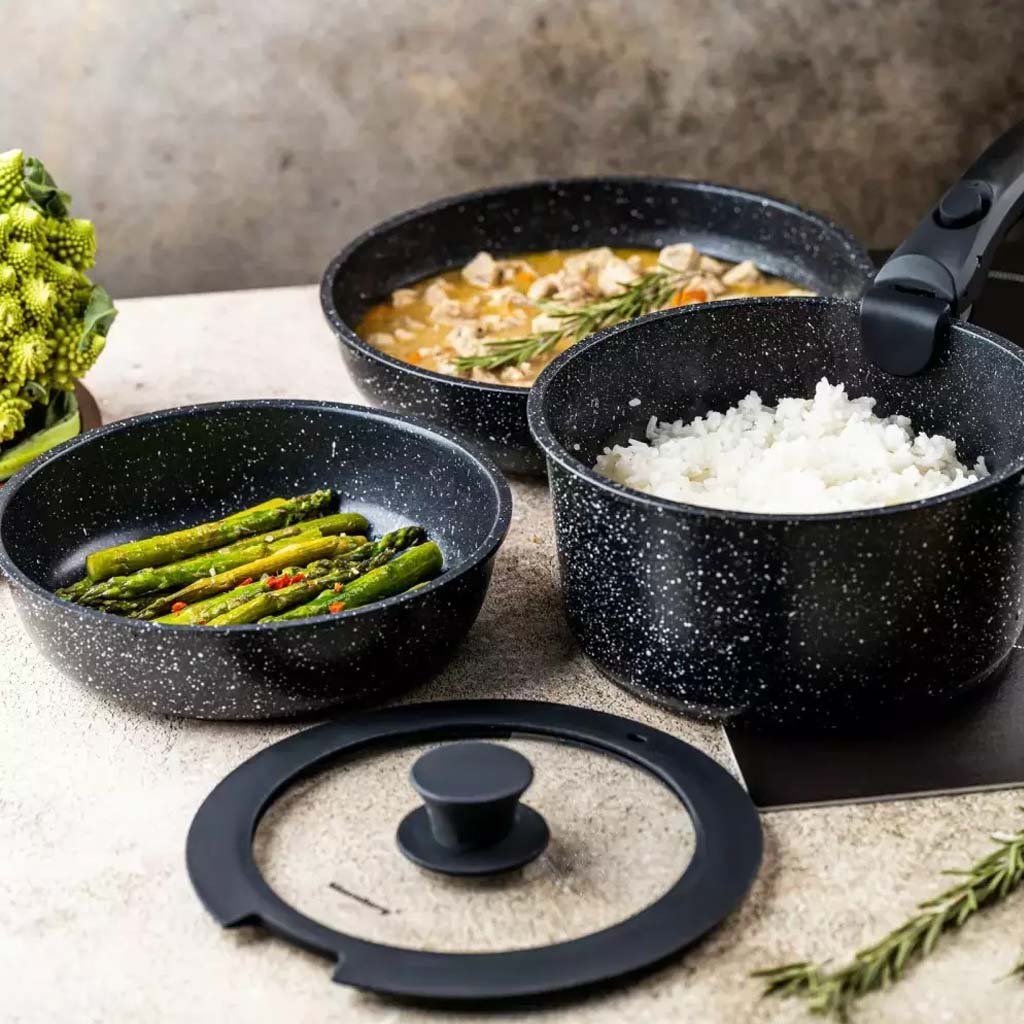 Az elegáns és praktikus, levehető fogantyúval ellátott edény- és serpenyőkészlet ideális választás minden modern konyhába. A márvány bevonat egyenletes hőelosztást és egészséges főzést biztosít, odaégés nélkül. Alkalmas ételek hűtőszekrényben való tárolására vagy sütőben való sütésre is.