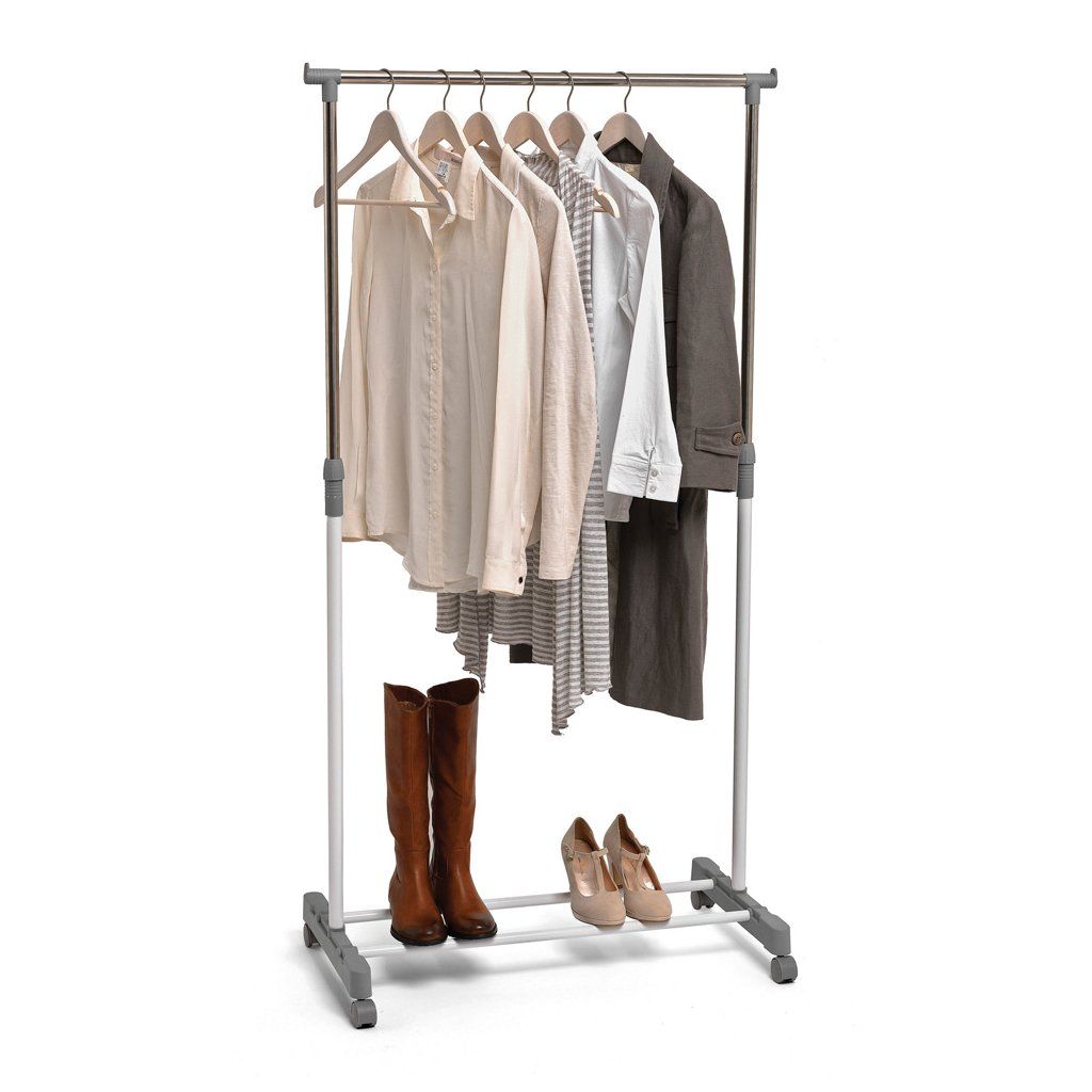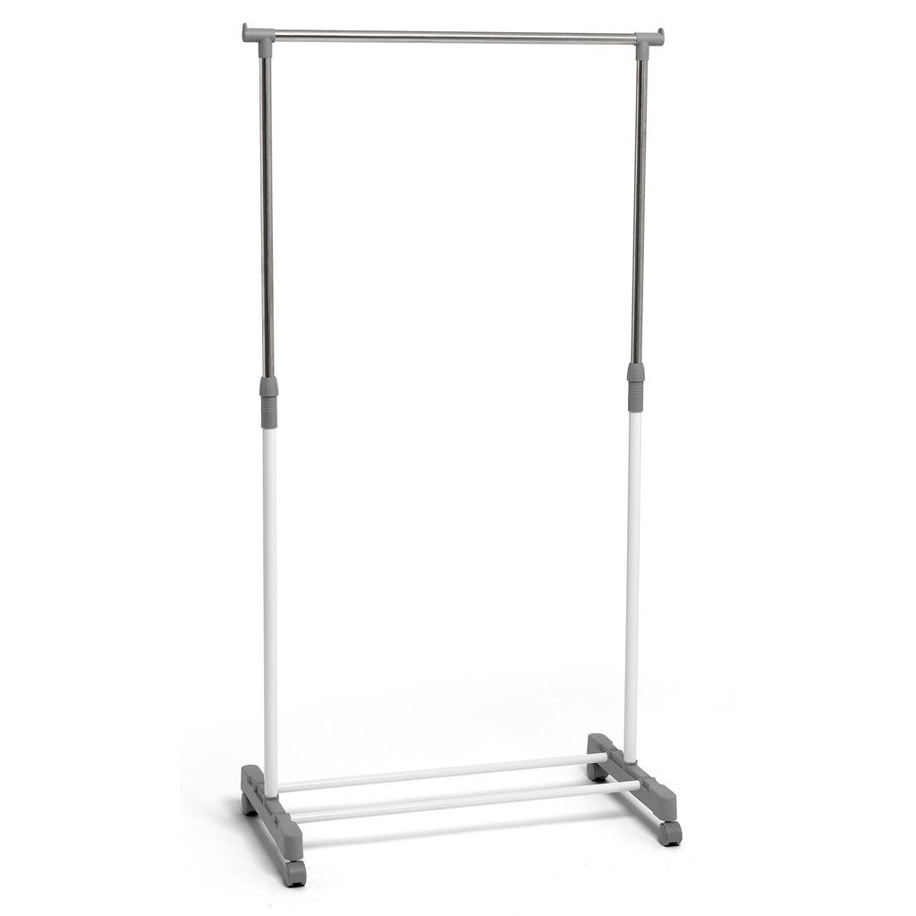 Állítható magasságú ruhatartó integrált polccal és forgó kerekekkel. Méretek 75 x 42 x 90-160v cm, fehér és szürke színben.