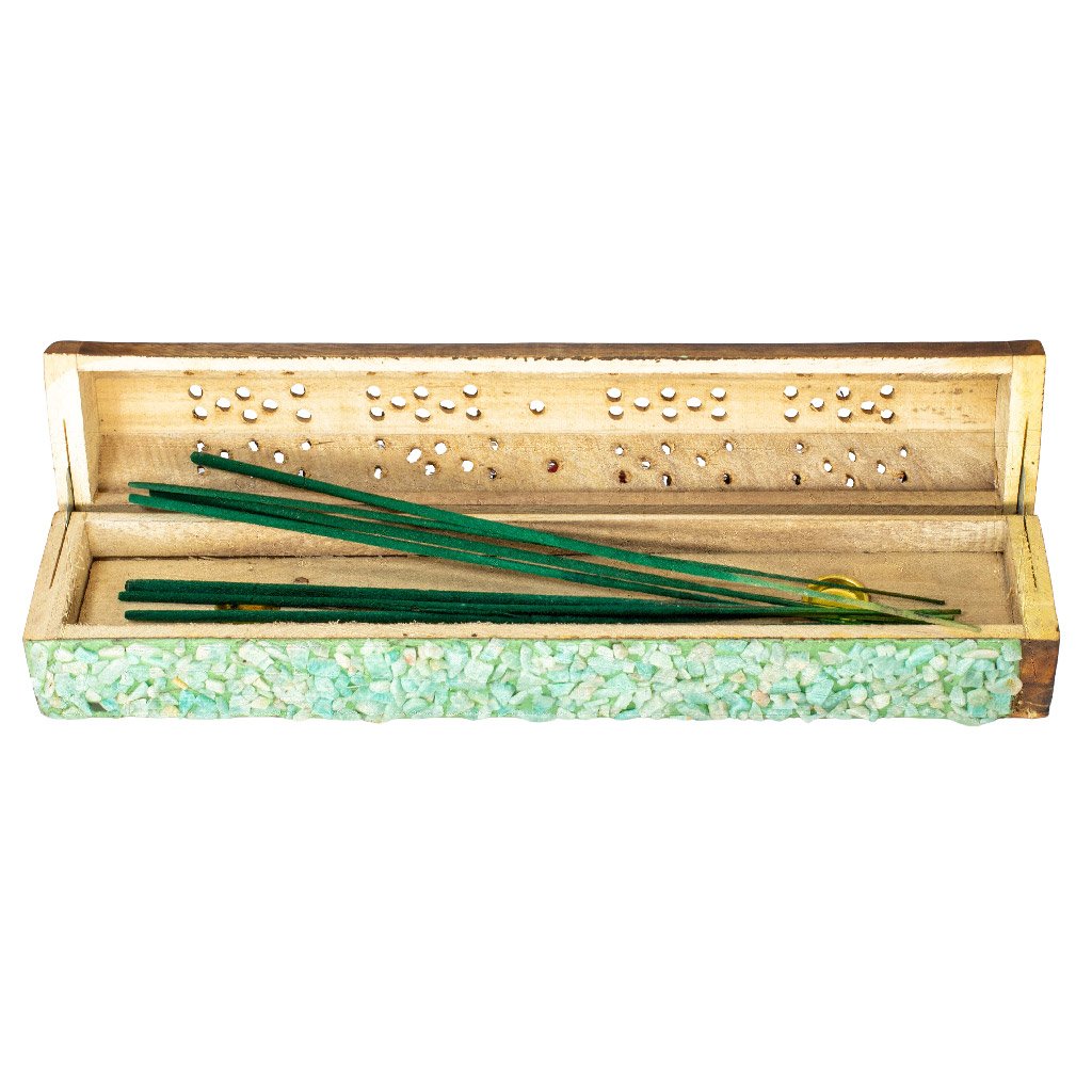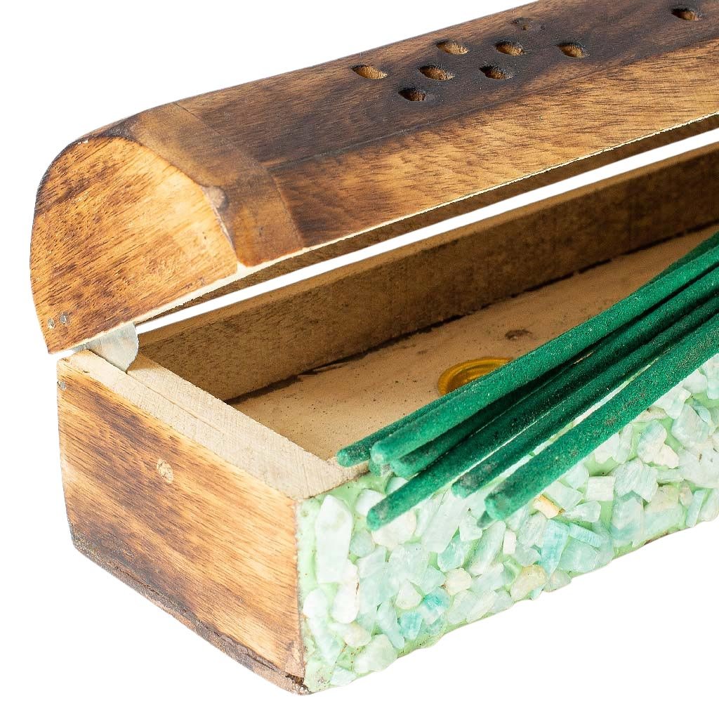Fából készült, dekoratív, zárható doboz vagy láda illóolajos rudakhoz, amazonit darabokkal díszítve. Ez a rendkívül nyugtató kő segít megnyugtatni a testet és a lelket. Az Amazonit legnagyobb hatása a szív területén van. Kapcsolatban áll a föld elemével.