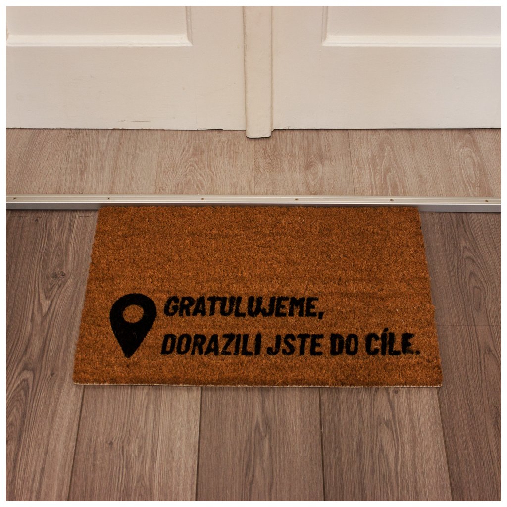 Eredeti szöveggel ellátott lábtörlő: "Megérkeztél a célba", amely mosolyt csal a látogatók arcára. Az ajtó előtti lábtörlő praktikus, szükséges és hozzájárul otthona tisztaságának megőrzéséhez.
