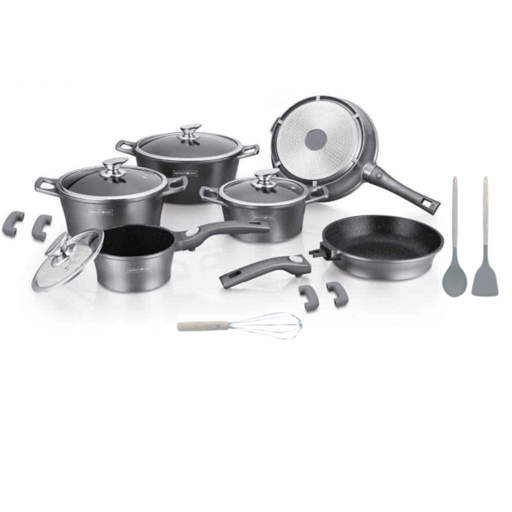 Konyhai edénykészlet ROYALTY öntött alumíniumból készült. A ROYALTY edényeket a kiváló minőségű edénykialakítás jellemzi antibakteriális, tapadásmentes márvány bevonattal, amely garantálja a az egészséges főzést. A tapadásmentes felületnek köszönhetően egészséges és diétás ételeket készíthet minimális zsiradékkal. A megerősített alj egyenletes hőelosztást tesz lehetővé, a kiváló hővezetésnek köszönhetően pedig a hő gyorsabban oszlik el. Az edény indukciós főzőlapokon is használható.