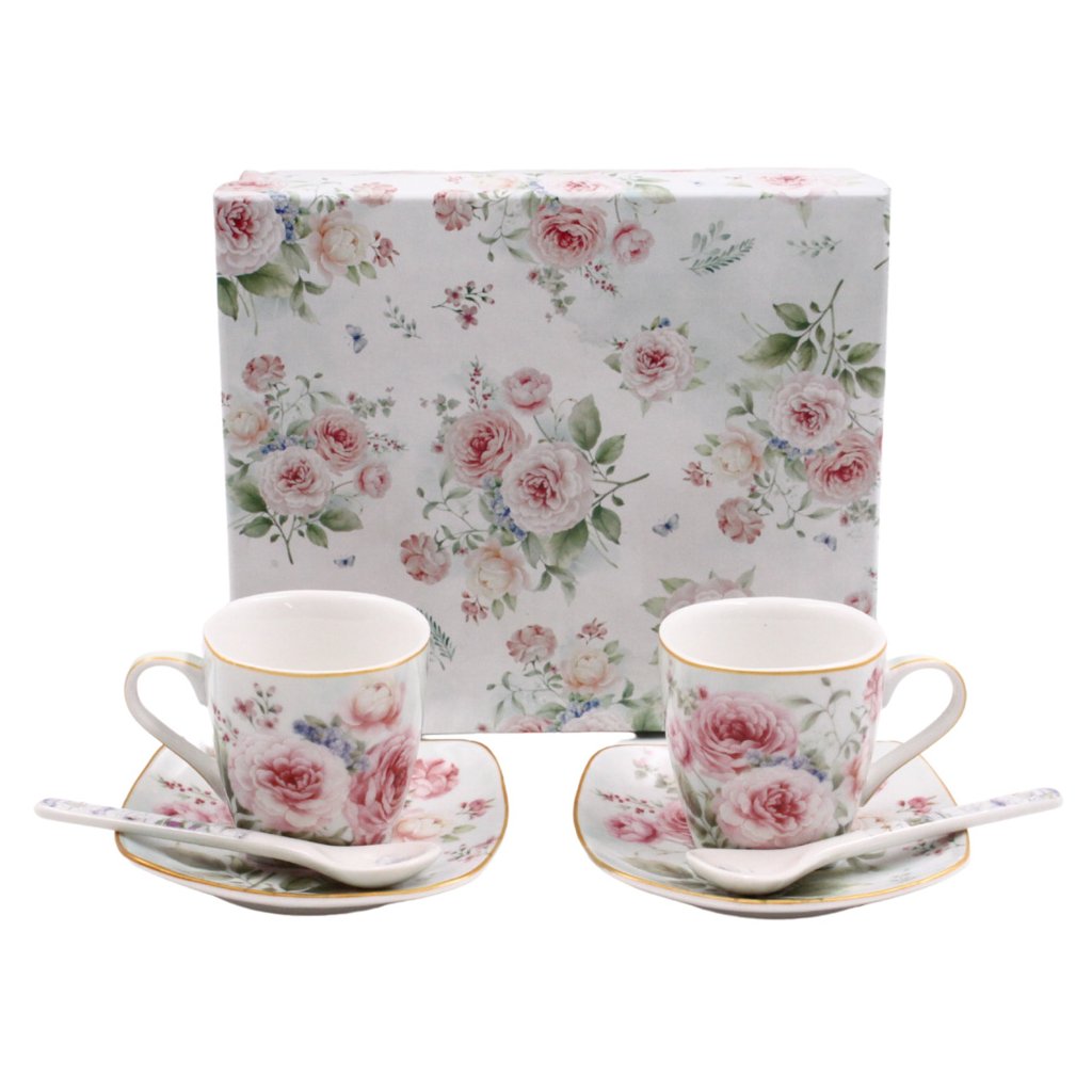 Luxus ajándékkészlet 2 darab porcelán csészével, alátéttel és kanállal, különösen alkalmas eszpresszóhoz. Az elegáns, gyönyörű, finom rózsamintás csészék ünnepi hangulatot teremtenek, így igazán élvezheti kedvenc kávéját. A készlet azonos díszítésű díszdobozba van csomagolva.