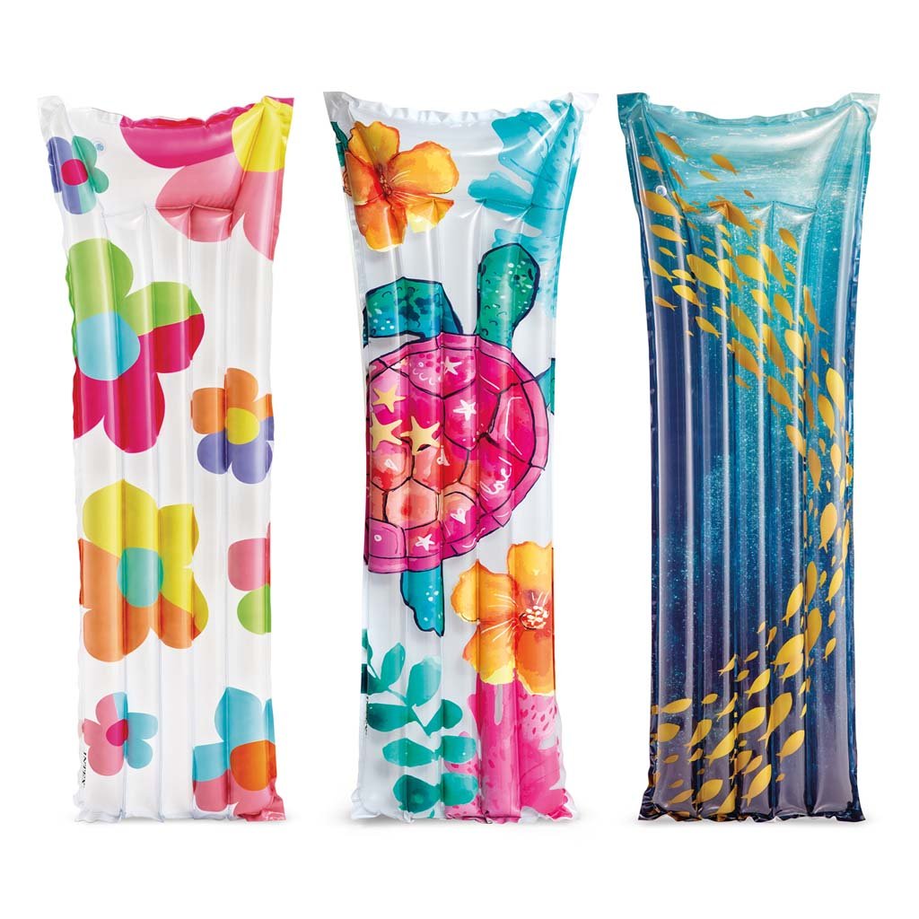 INTEX felfújható matrac 183 x 69 cm-es méretben, gyönyörű mintával és beépített párnával. Ez a modell két légkamrával rendelkezik. A csomag tartalmaz egy javítókészletet is kisebb sérülésekhez.