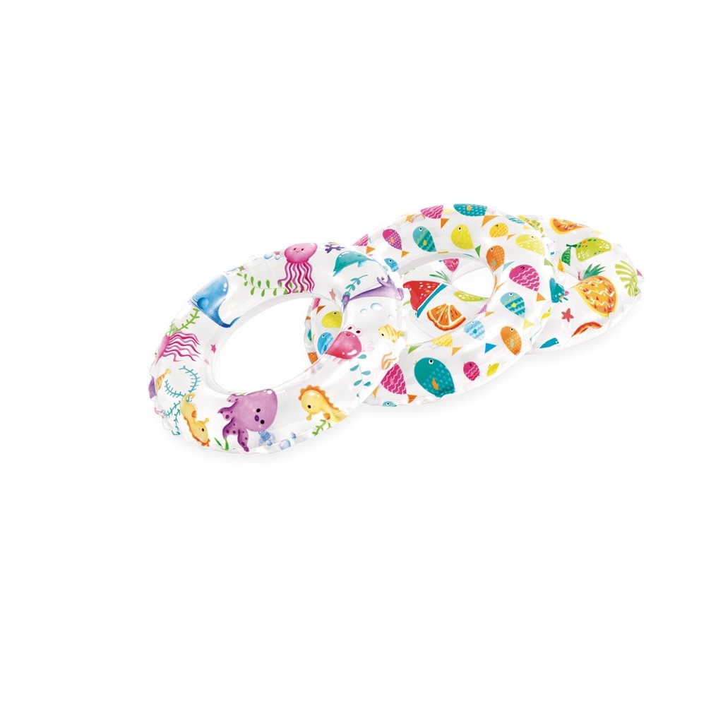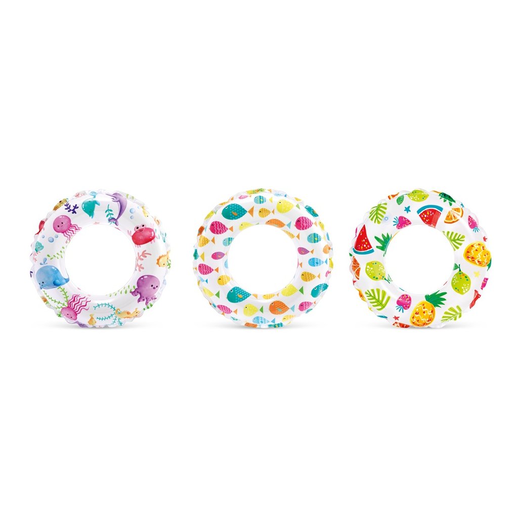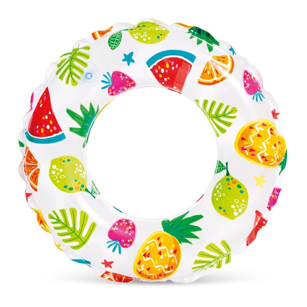 INTEX 51 cm átmérőjű, színes gyümölcsmintás felfújható úszógumi. Használható úszáshoz és szórakozáshoz a vízben. A nyári vakációhoz kötelező a gyerekeknek.