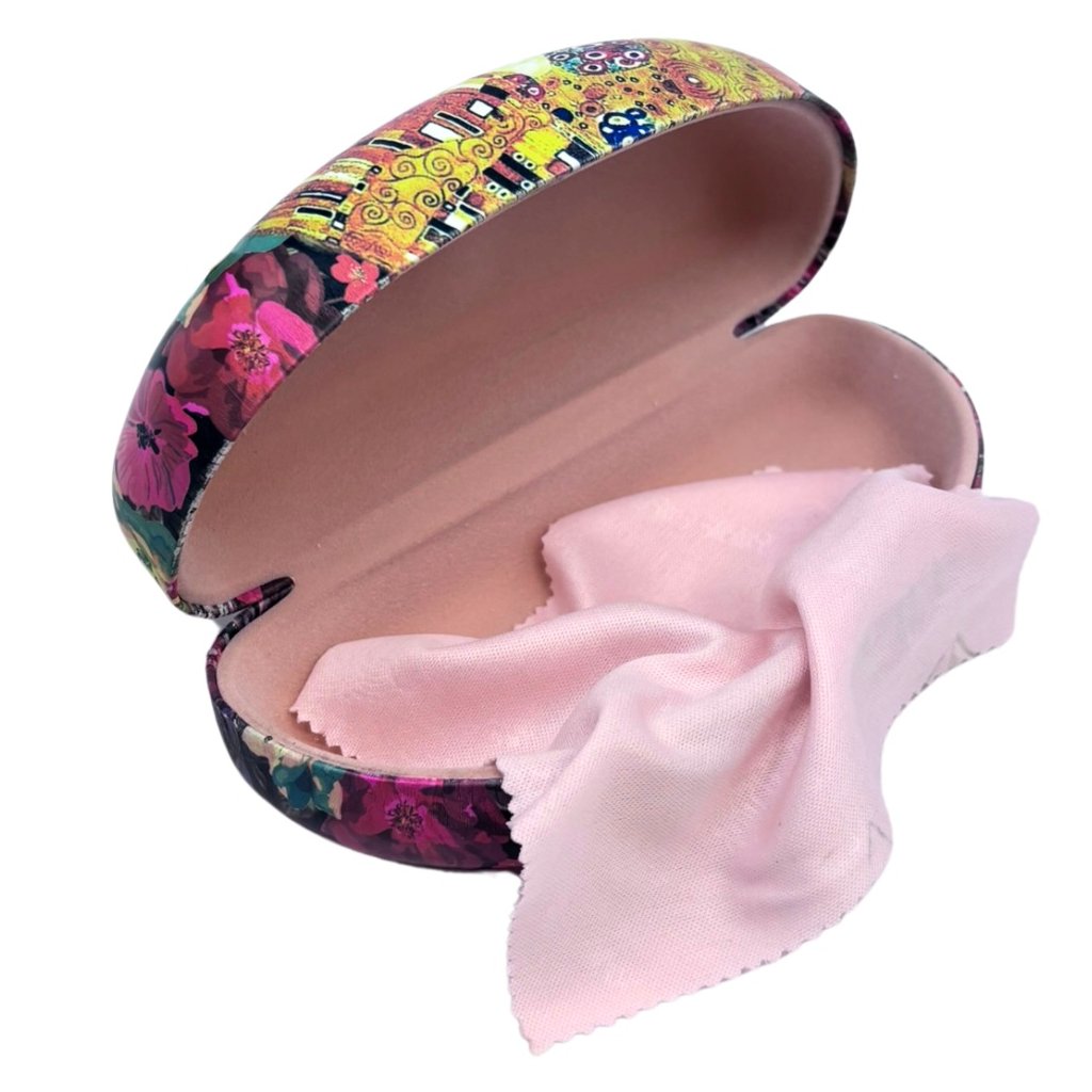 Kemény tok dioptriás szemüvegekhez, törlőkendővel, melynek motívuma Gustav Klimt - A csók című festménye.