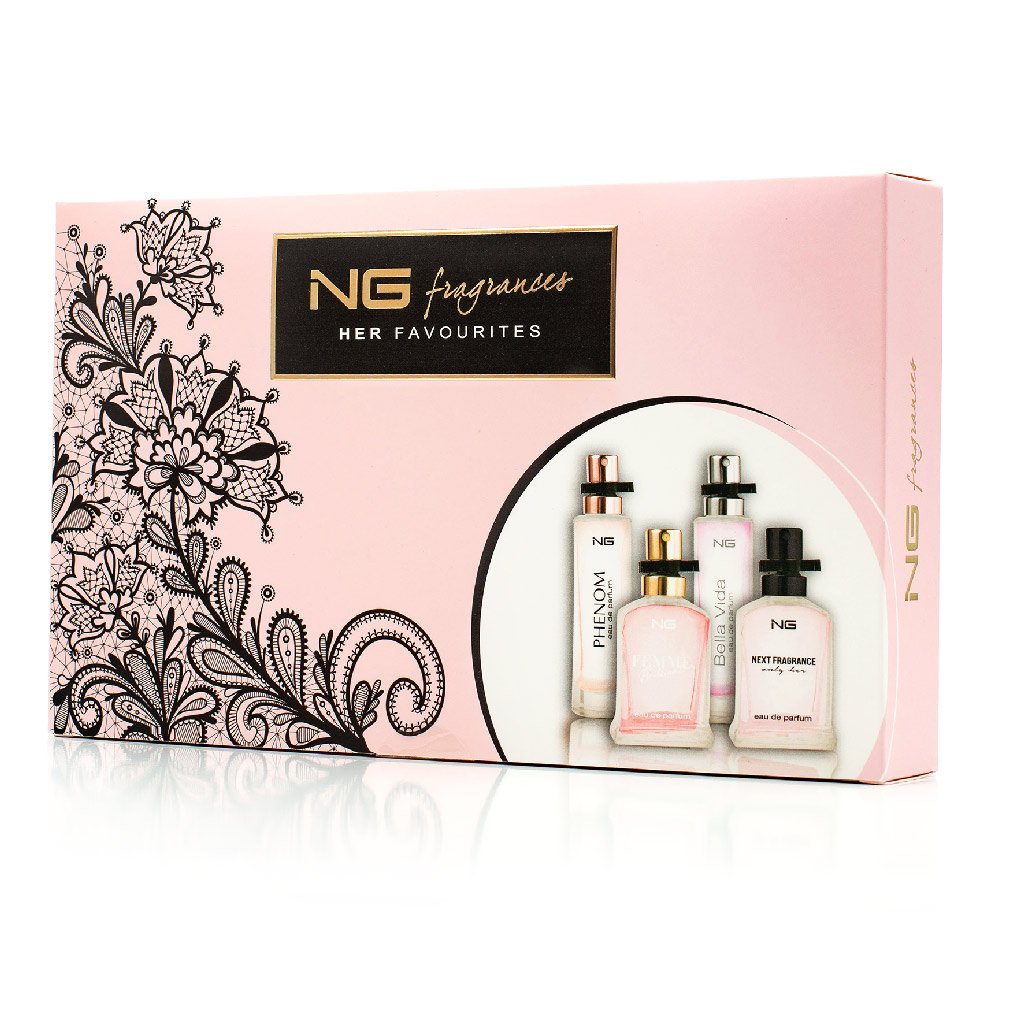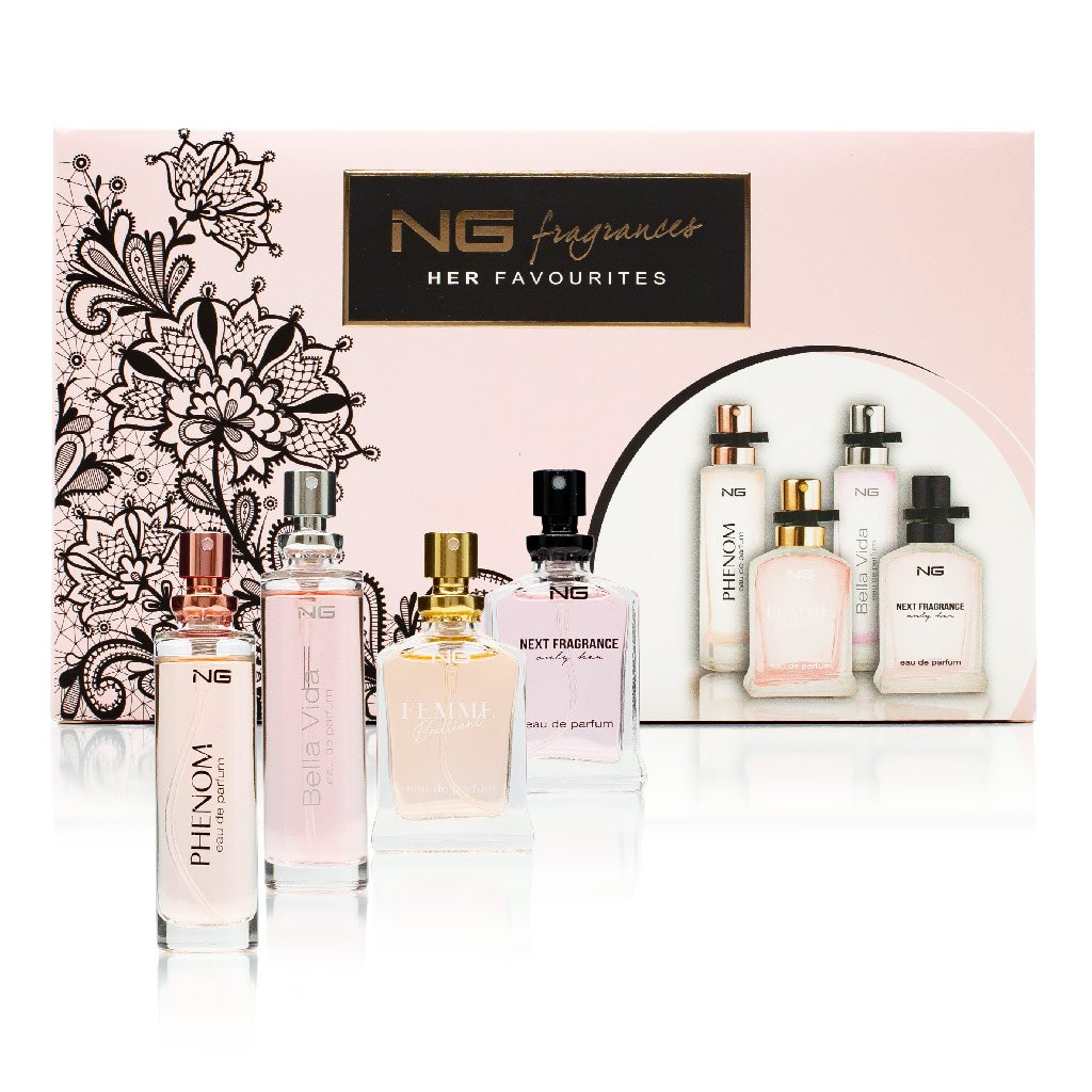 A Her Favourites ajándékkészlet négy ikonikus illatot tartalmaz elegáns mini kiszerelésben – ideális azoknak a nőknek, akik szeretik a változatosságot, és minden alkalomra más hangulathoz más illatot szeretnének viselni. A parfümök mindegyike a női személyiség egy másik oldalát tárja fel – a finom romantikától az érzéki magabiztosságig.