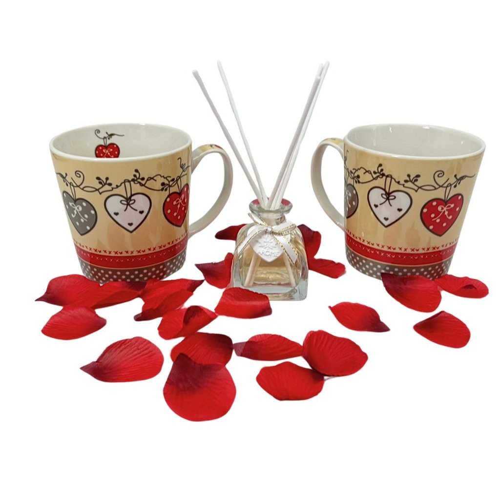 Eredeti ajándék szeretteidnek. Akár Valentin-napra, születésnapra, évfordulóra, vagy csak úgy, szeretettel. Az ajándékkészlet két szívmintás porcelánbögrét és egy illatosító pálcás diffúzort tartalmaz, amely megteremti a megfelelő romantikus hangulatot.