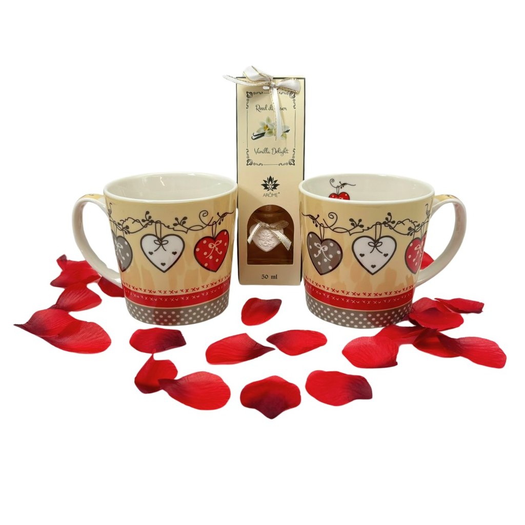 A Valentin-napi szett már ajándékcsomagolásban van. Porcelánbögréket és vanília illatú párologtatót tartalmaz.