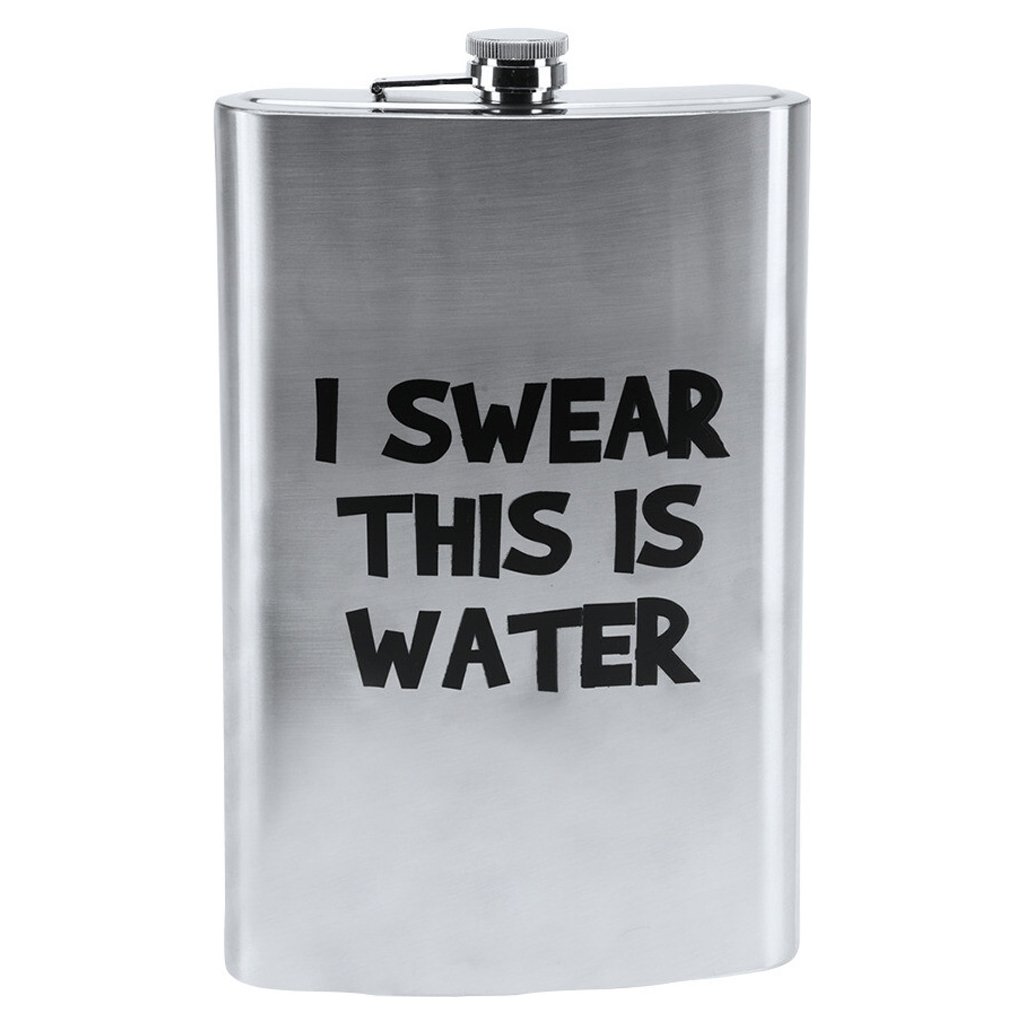 Ez a nagy, rozsdamentes acélból készült laposüveg remek ajándékötlet. A termék egy I swear this is water felirattal van díszítve - Esküszöm, hogy ez víz