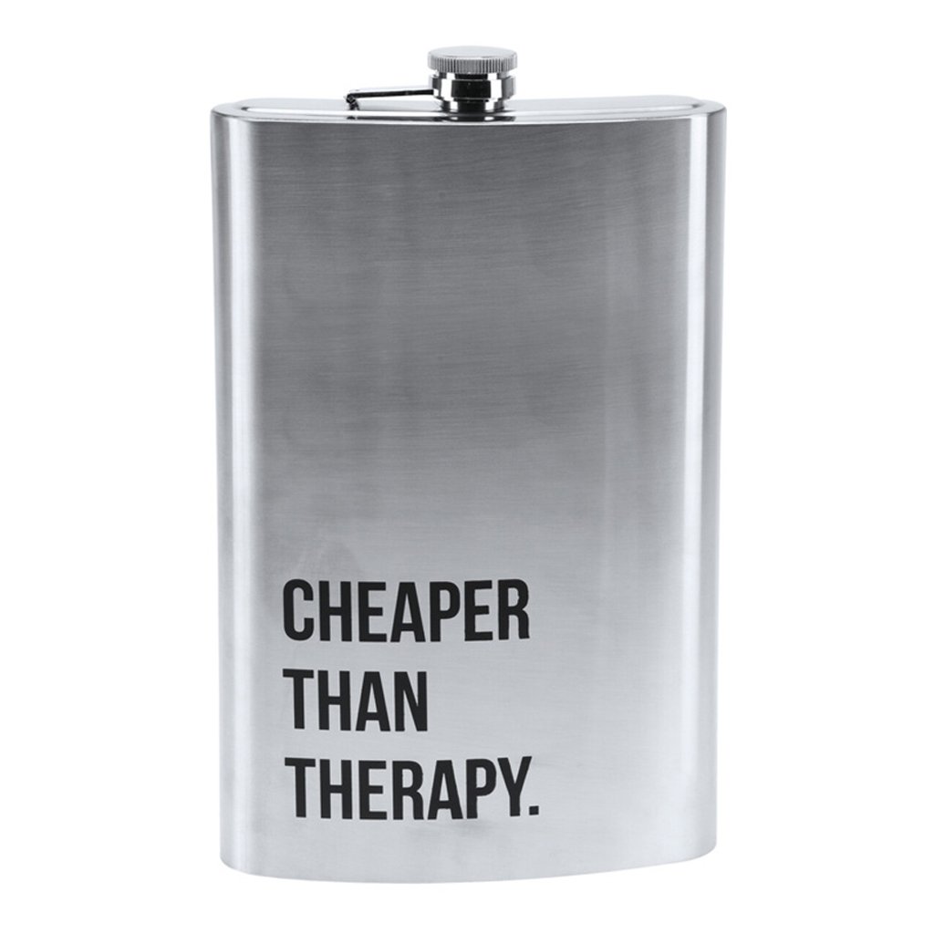Ez a nagy, rozsdamentes acélból készült laposüveg remek ajándékötlet. A Cheaper than therapy felirattal van díszítve - Olcsóbb, mint a terápia