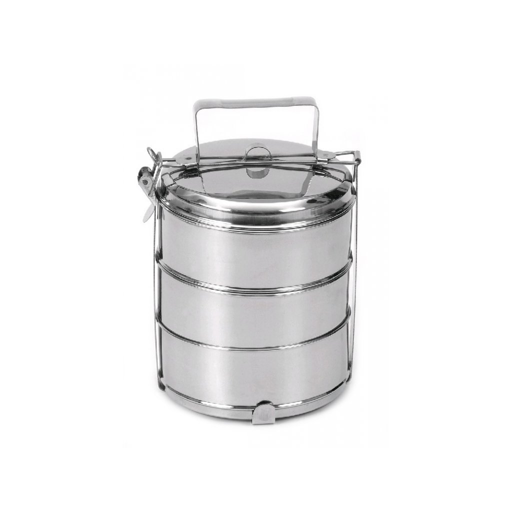 A háromrészes, rozsdamentes acélból készült ételhordó az ételek kényelmes szállítására szolgál. A következőkből áll: 3 tál és fedő, melyeket egy praktikus csattal ellátott fogantyú köt össze.