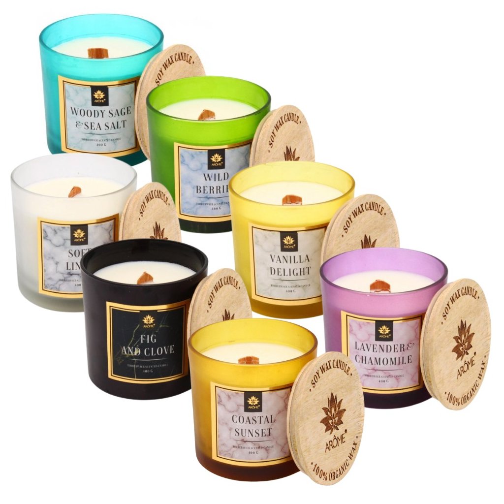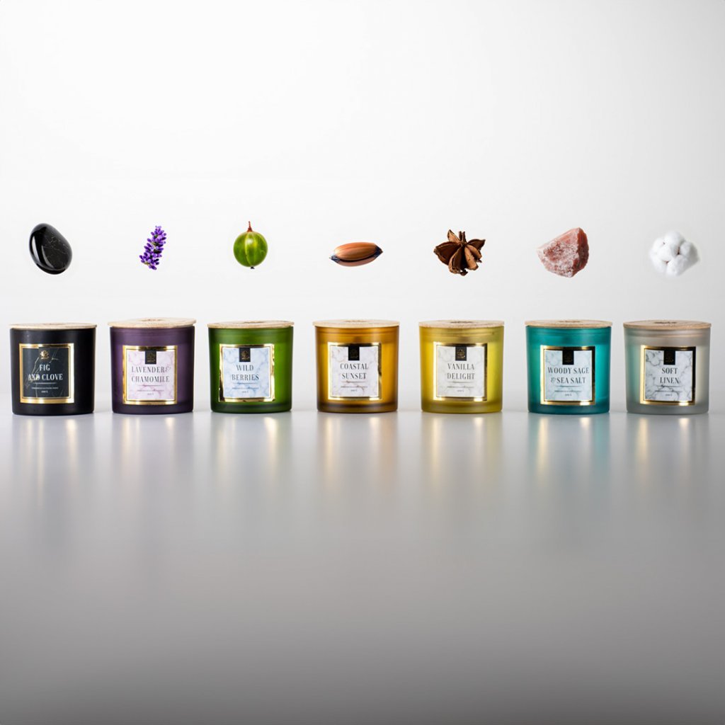 A gyertyák készültek 100%-ban természetes szójaviaszból. A gyertyaszínes üvegpohárban, fa fedővel van elhelyezve. Ez a szokatlan illatokból álló készlet kedvezményes áron kapható, és nagyszerű ötlet egy luxus ajándékhoz.