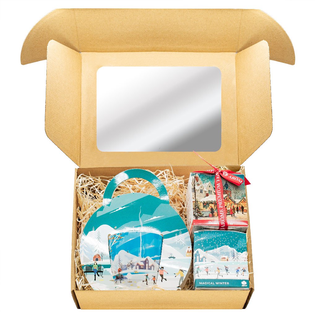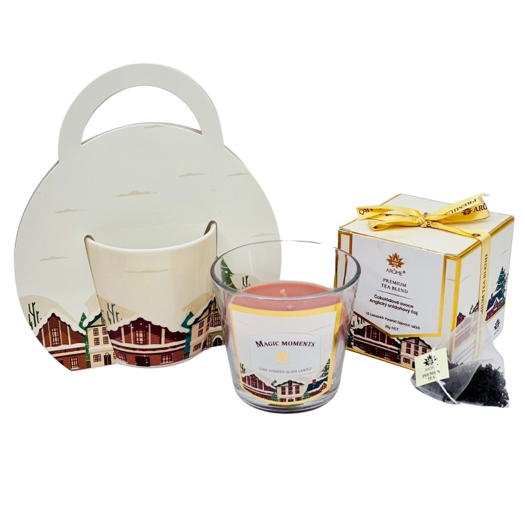 Ajándékkészlet porcelán bögrével, fekete teával és gyertyával, mindez ugyanabban a karácsonyi dekorban, havas város és zöld növényzet sziluettjével. Az ajándékcsomagolásnak köszönhetően a készlet azonnal ajándékozásra kész.