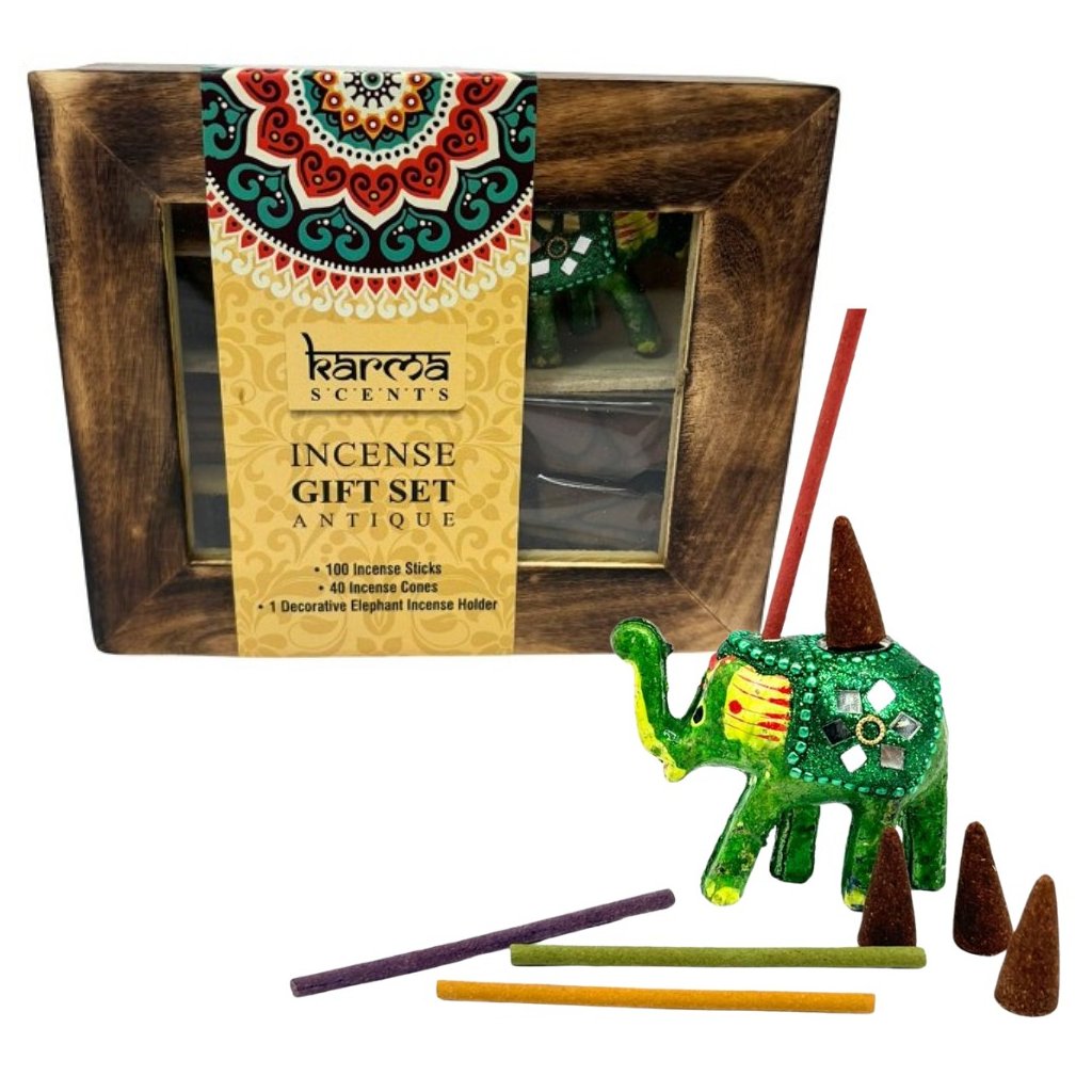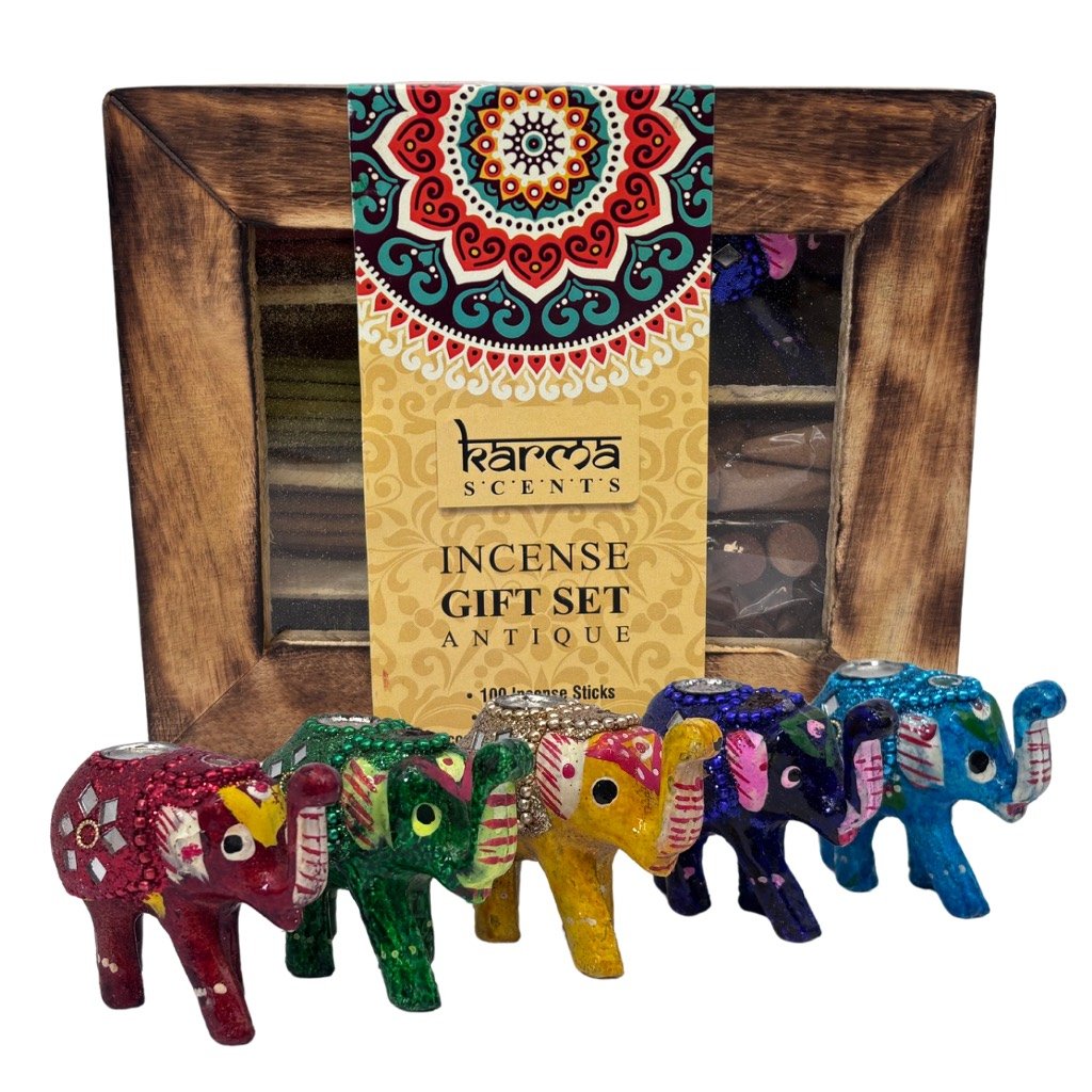 Ajándékdoboz füstölők és tömjének Karma az ARÔME kollekcióból válogatást tartalmaz 4 féle illatú füstölőt és 2 féle illatú tömjént tartalmaz. A csomag tartalmaz egy elefánt formájú tartót is.