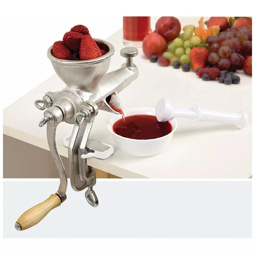 Kézi öntöttvas gyümölcs- és zöldségfacsaró, öntöttvasból. A robusztus öntöttvas szerkezet biztosítja a felhasználók számára a gyümölcscentrifuga hibamentes működését annak teljes élettartama alatt, és lehetővé teszi az egészségesebb életmódot. A fogantyú ergonomikus kialakítása kedvezően befolyásolja a készülék teljesítményét a puha gyümölcsök és zöldségek préselésekor.
