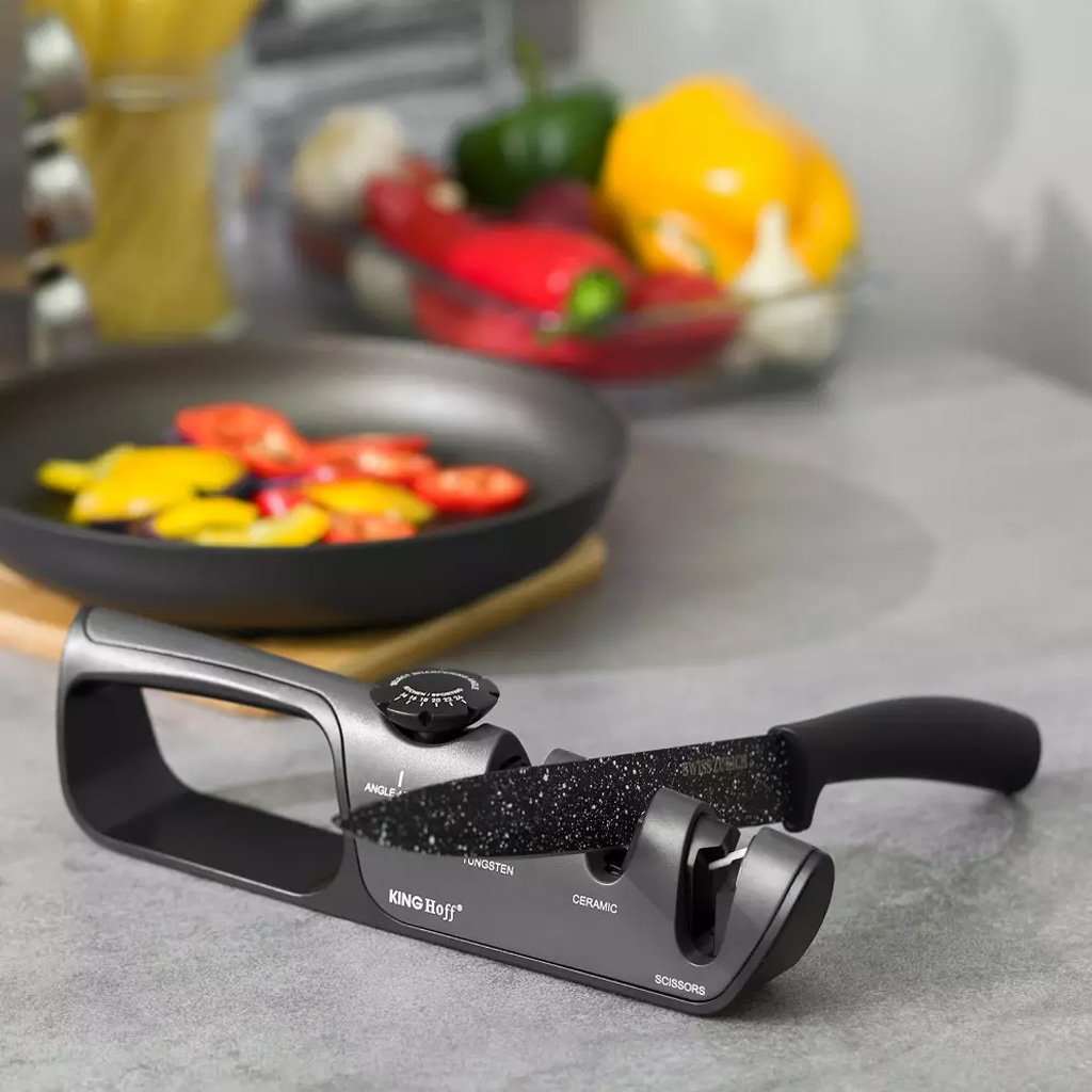 Nagyszerű segítőtárs egyszerű használattal. Két állítható nyílás áll rendelkezésre. A durva, karbiddal ellátott köszörűhornyot tompa vagy sérült kések élezésére használják. A finom rés kerámia rudakkal van ellátva a kés élének befejezéséhez, valamint a már éles kés napi könnyítéséhez és karbantartásához.