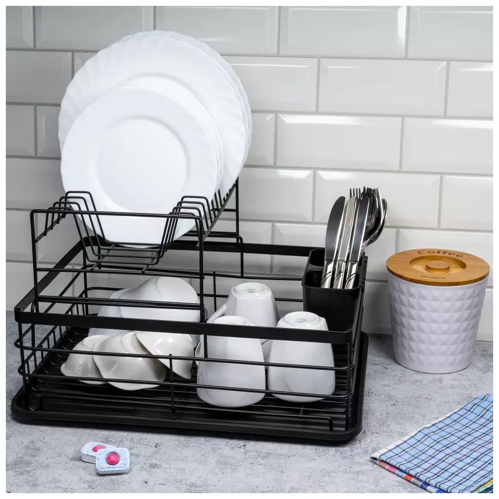 Az edényszárító nagy és kis konyhákban is használható. Univerzális színének köszönhetően minden enteriőrben jól mutat. Ezenkívül az edényszárító praktikus edénytartóval van felszerelve. A 2 rekeszre osztás lehetővé teszi a kanalak, villák és kések egyszerű szétválogatását, ami segít rendet tartani a konyhában. A kétszintes edényszárító stabil, ami biztosítja a biztonságot használat közben.