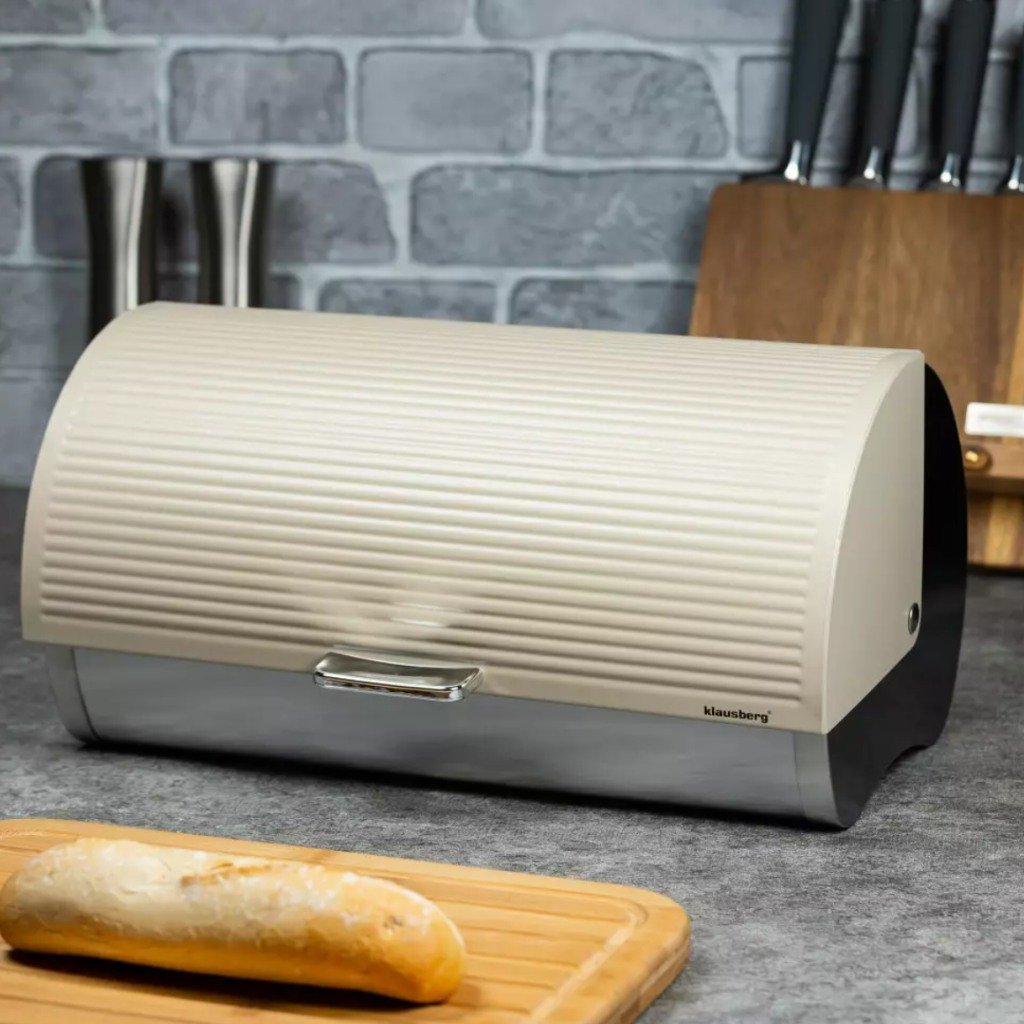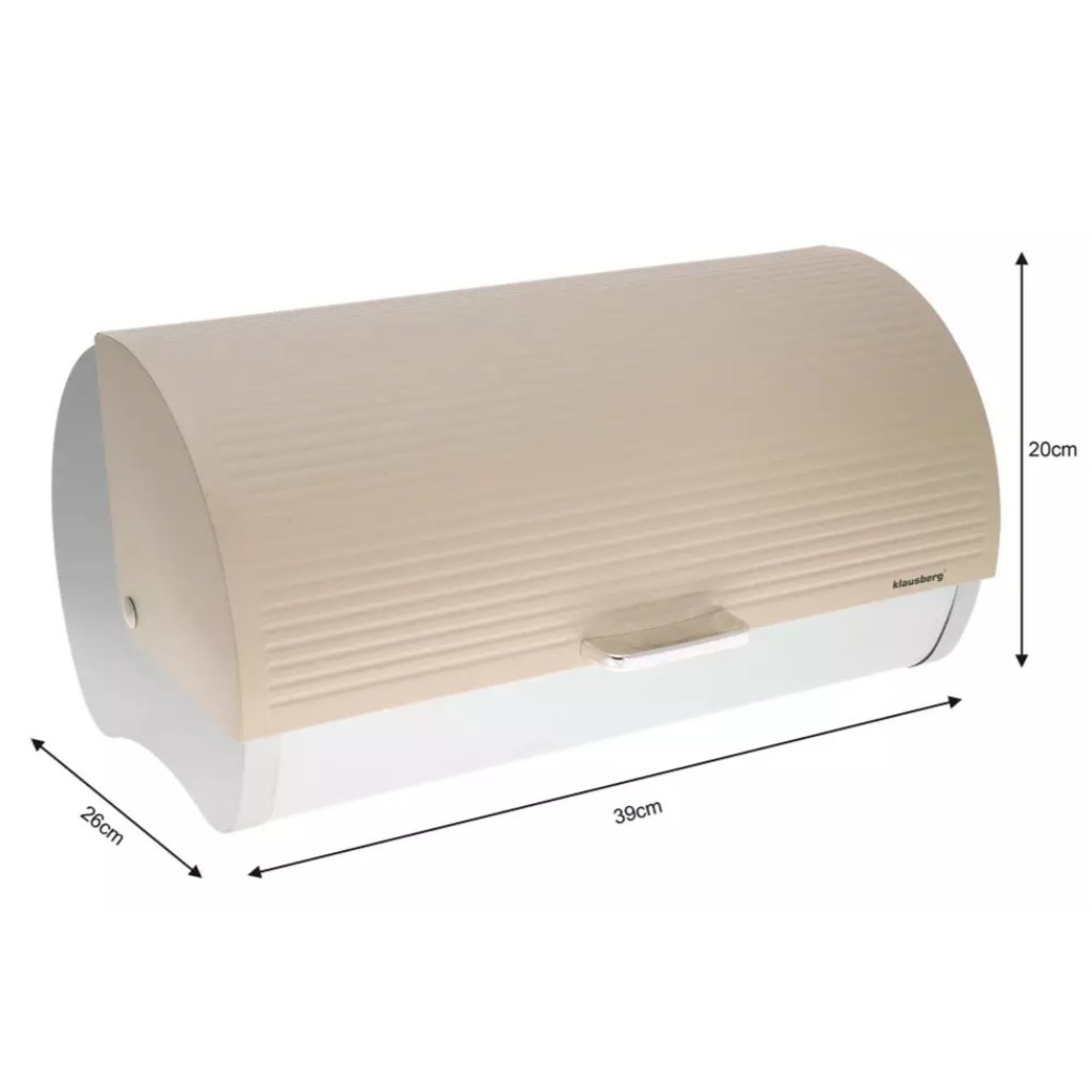 Kenyérdoboz nemesacélból, ezüst színben. Bézs színű, zománcozott fedéllel. Mindenféle kenyér tárolására alkalmas: kenyér, zsemle, bagett és még muffin is. A visszahúzható fedél simán nyílik és záródik, nyitáskor nem igényel további helyet.