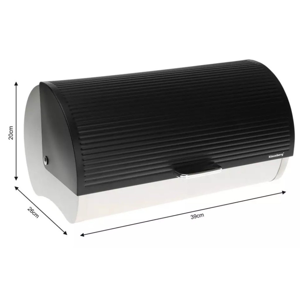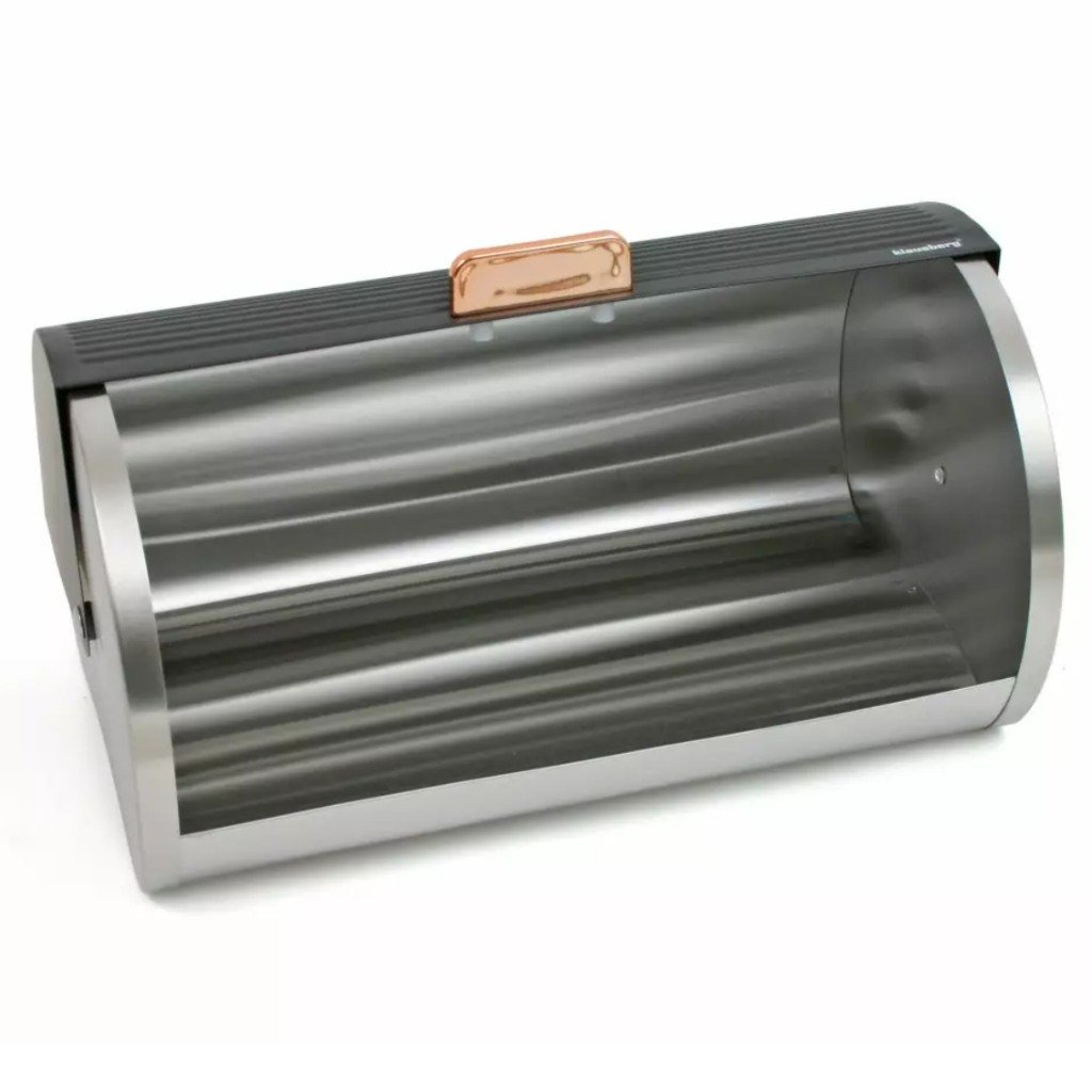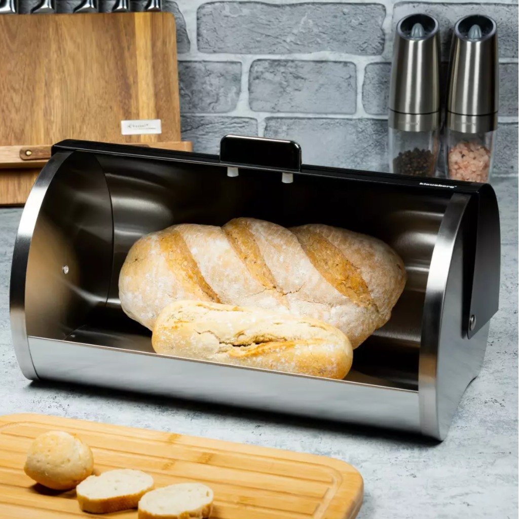 Kenyérdoboz nemesacélból, ezüst színben. Fekete zománcozott fedél. Mindenféle kenyér tárolására alkalmas: kenyér, zsemle, bagett és még muffin is. A visszahúzható fedél simán nyílik és záródik, nyitáskor nem igényel további helyet.