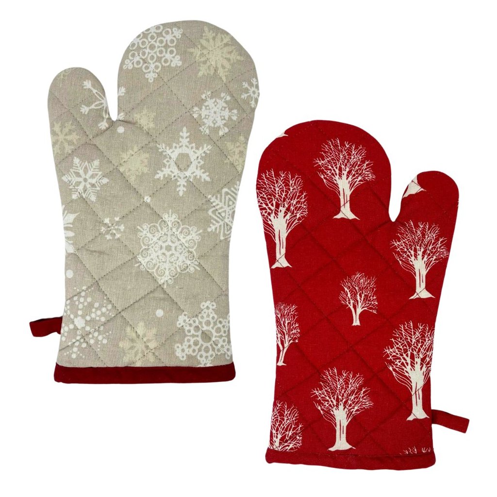 Az egyik oldalon a konyhai kesztyű szürke háttérrel hópelyhekkel van nyomtatva, a másik oldalon pedig fehér fák piros háttérrel. Ugyanezzel a mintával Červené Vánoce más konyhai textíliákat is talál nálunk.