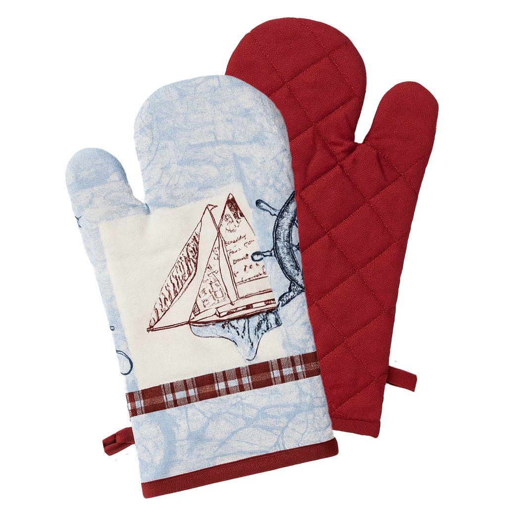 A konyhai kesztyű egyik oldala tengerészeti motívumokkal rendelkezik - vitorlás és kormányminta, a másik oldala egyszínű piros. A fogókesztyűbe mágnes van varrva, és akasztó is a szükség szerinti felakasztáshoz.