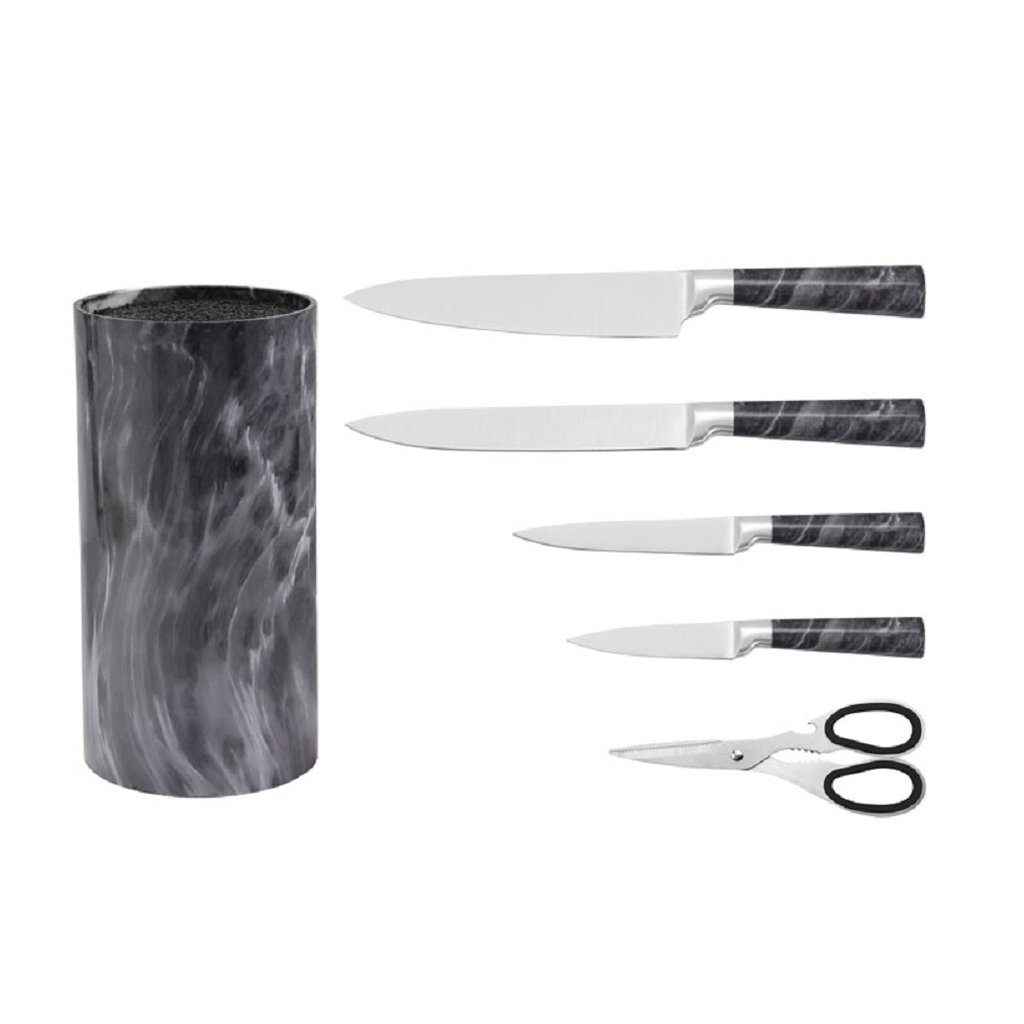 Márvány mintás állványban lévő rozsdamentes acél konyhai késkészlet. 6 darabos készlet.