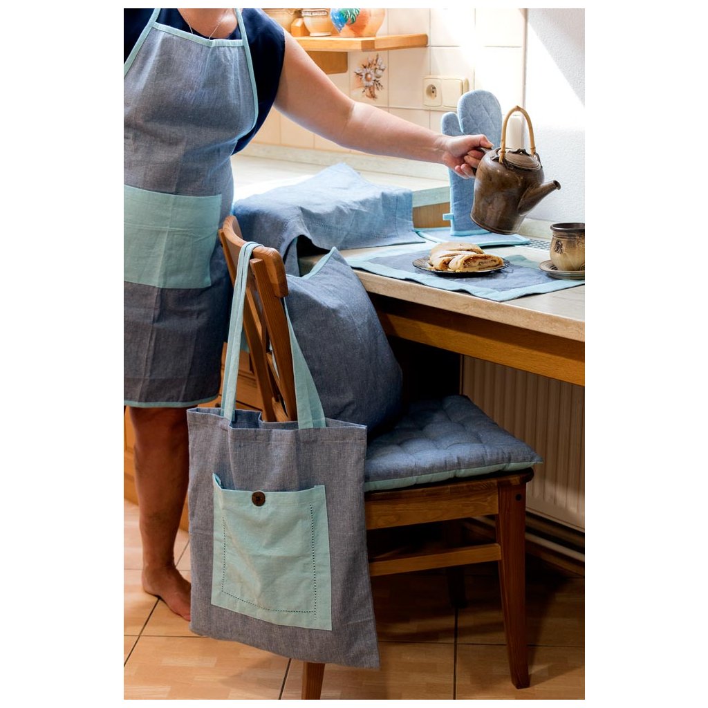 Konyhai kötény újrahasznosított pamutból természetes, világoskék és sötétkék színárnyalatban, praktikus zsebbel, díszítő tűzéssel, szegéllyel és barna kókuszgombokkal díszítve. A világoskék nyakpántok nagyobb méretre is állíthatók férfiak számára a befűző csat segítségével.