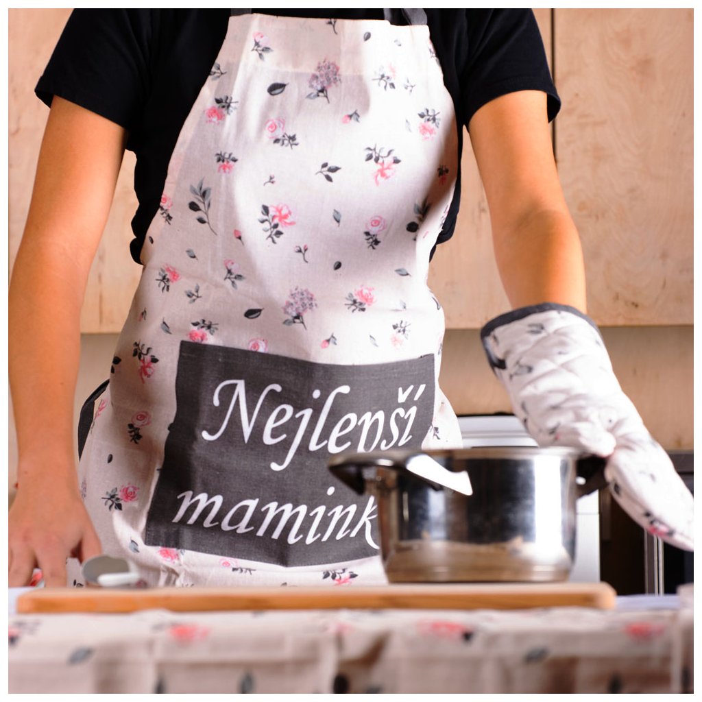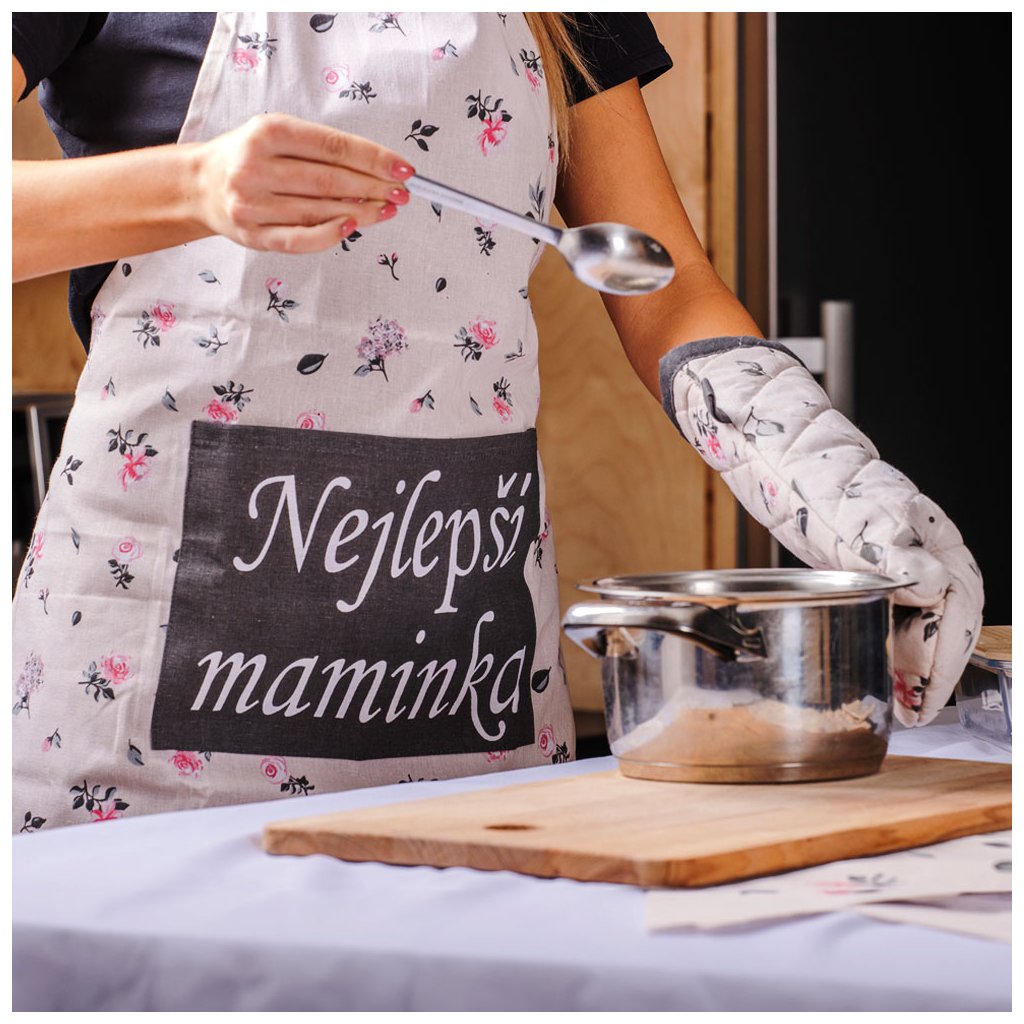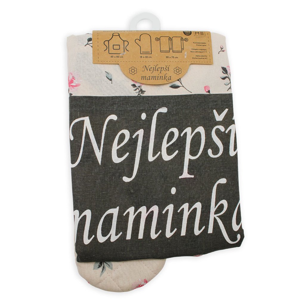 Ajándékozzon anyukájának praktikus textil konyhai eszközöket szép színekben és kedves Legjobb anyuka felirattal. A kedvező árú szett tartalmaz egy csinos kötényt, egy steppelt edényfogót és 2 darab konyharuhát. Erre van szüksége az anyukának a konyhában minden nap.