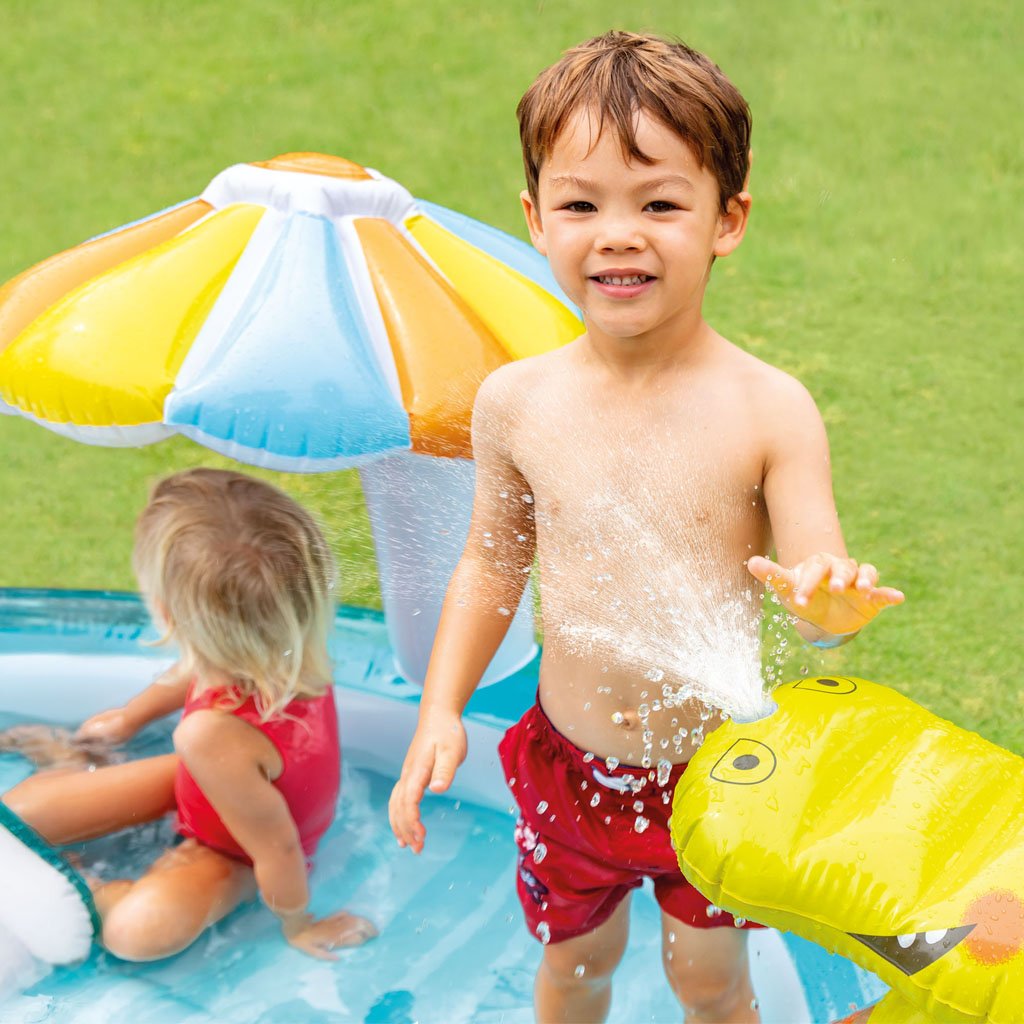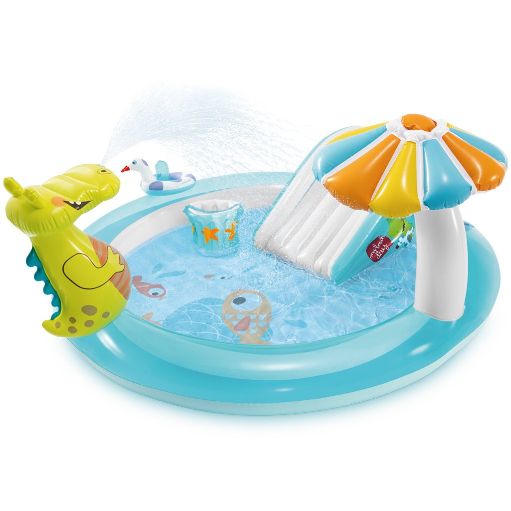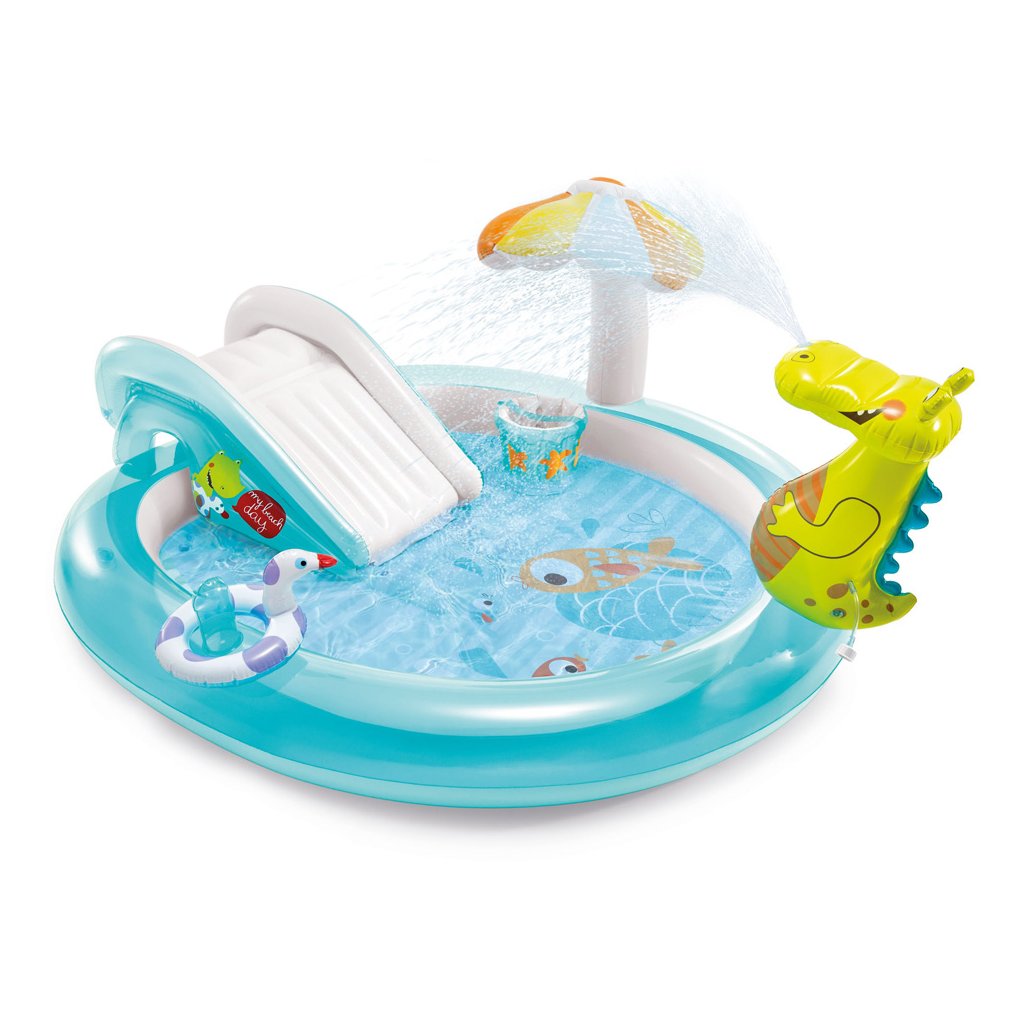 Az INTEX krokodilos játszóközpont egyszórakoztató medencés játszóközpont csúszdával, vízi zuhannyal (kerti tömlő csatlakoztatás), gyermekpancsolóval és egyéb kiegészítőkkel.