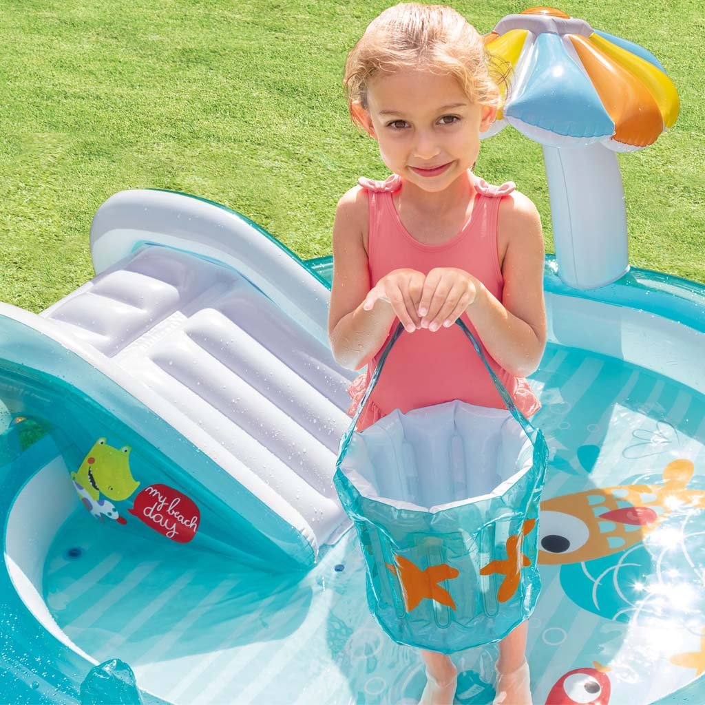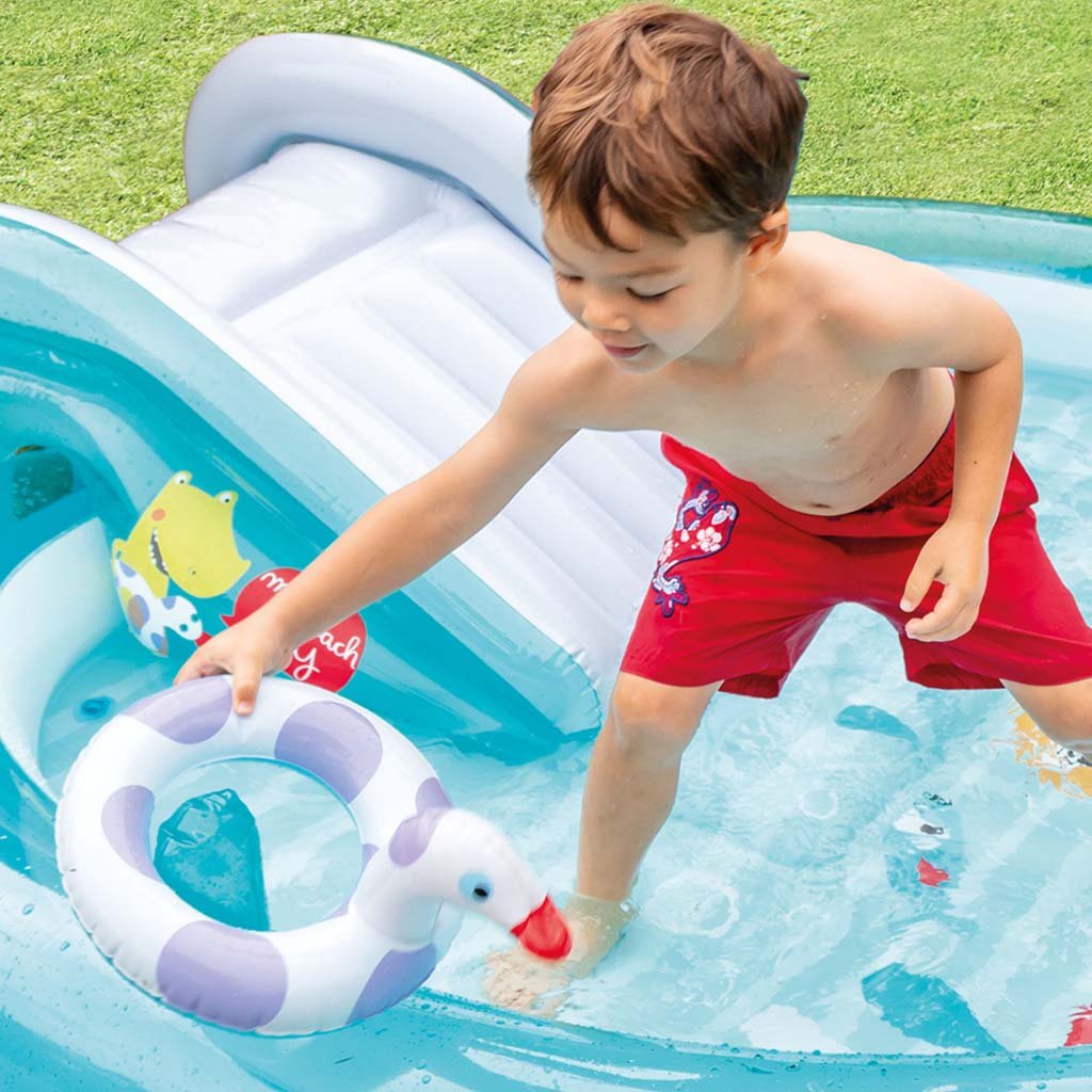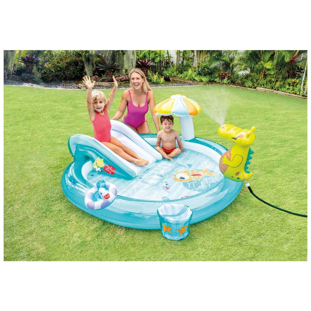 Az INTEX krokodilos játszóközpont egyszórakoztató medencés játszóközpont csúszdával, vízi zuhannyal (kerti tömlő csatlakoztatás), gyermekpancsolóval és egyéb kiegészítőkkel.