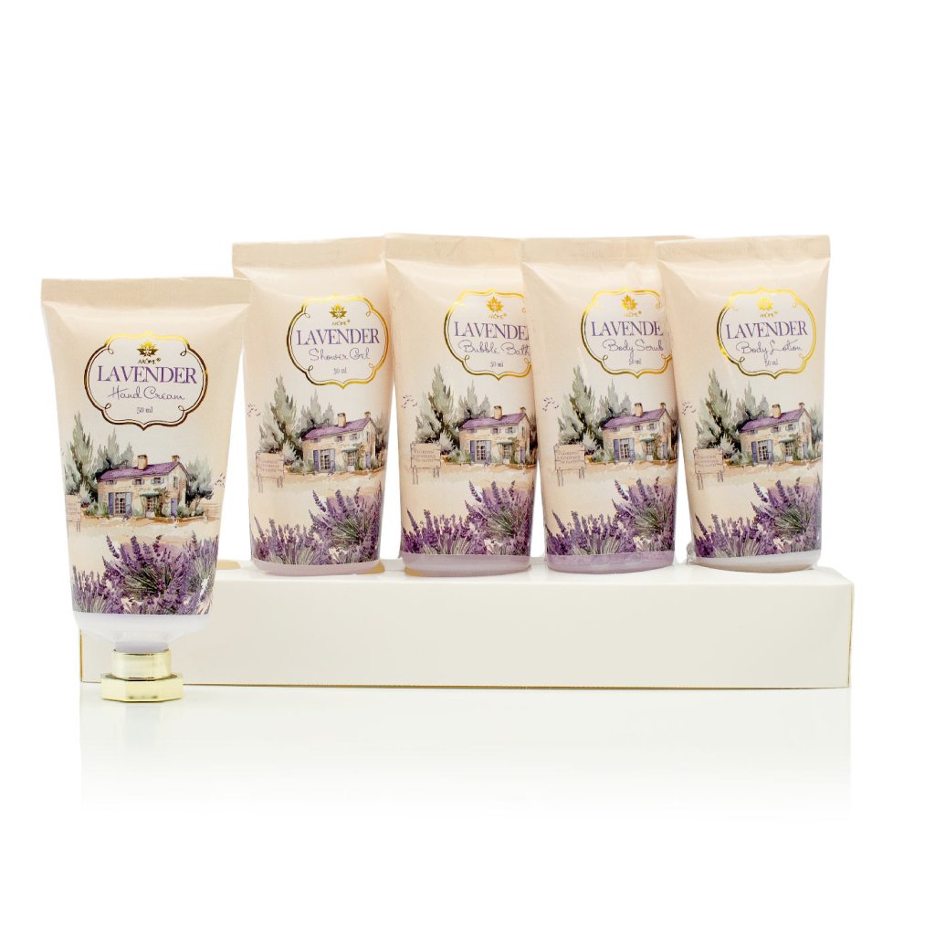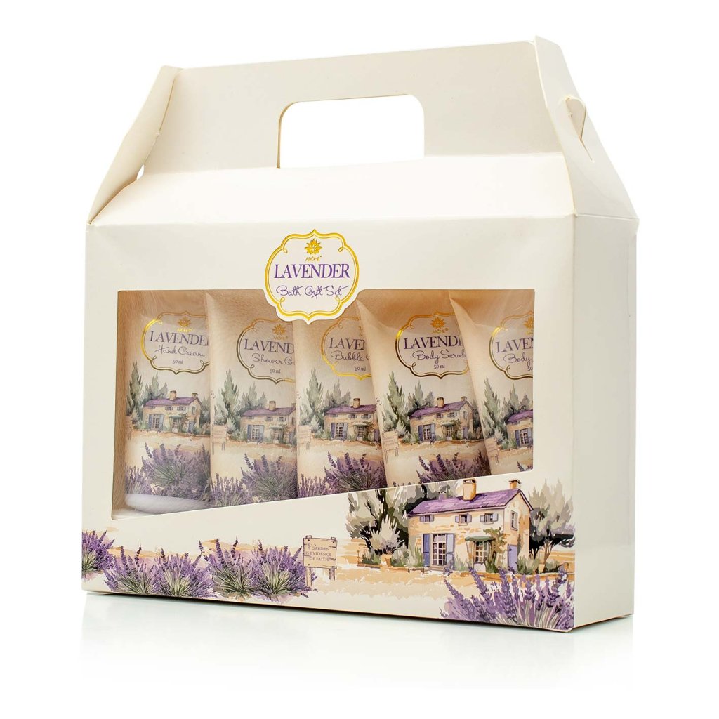 A készlet dísz papírtáskába van csomagolva. A kozmetikumok mindennapi használatra készültek. Levendula illattal.