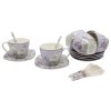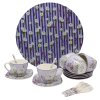 Elegáns, kiváló minőségű, vékony porcelán teás- vagy kávéskészlet finom, levendulás virágmintával. A készlet hat porcelán csészéből, alátétből és kanálból áll, és díszdobozba van csomagolva.
