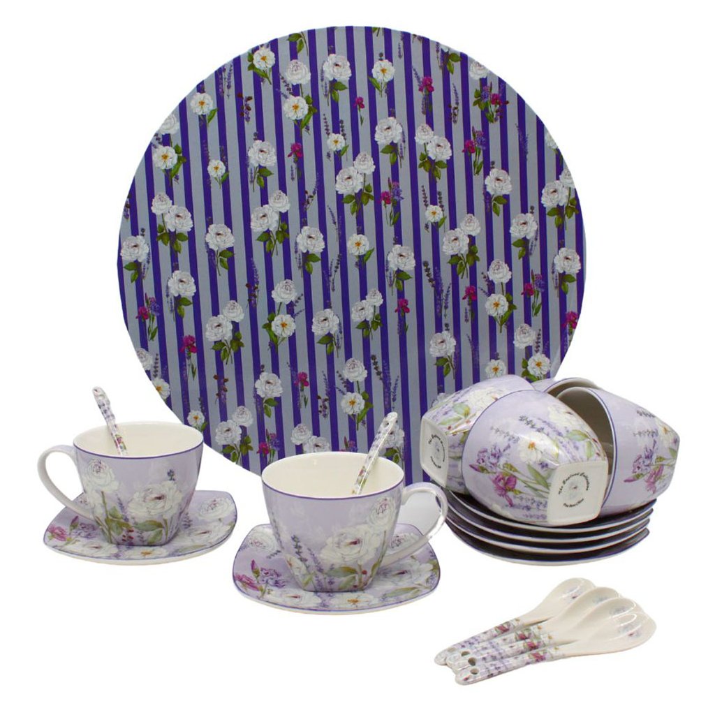 Elegáns, kiváló minőségű, vékony porcelán teás- vagy kávéskészlet finom, levendulás virágmintával. A készlet hat porcelán csészéből, alátétből és kanálból áll, és díszdobozba van csomagolva.