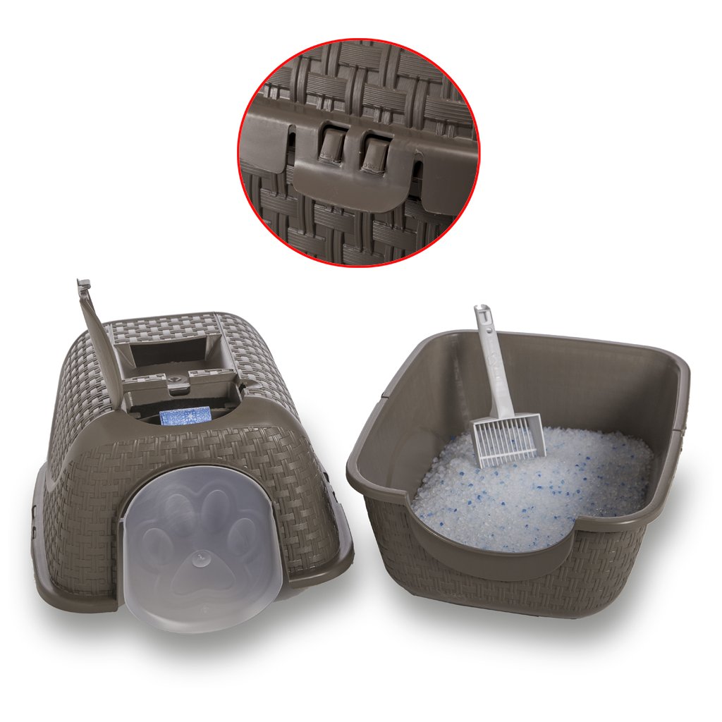 A felhajtható elülső fedél bejáratként szolgál. AA felső részben aktív szénszűrő található a szagok ellen, valamint egy zacskótartó. Itt található még egy beépített praktikus lapát a toalett alom cseréjéhez, amely egyben fogantyúként is funkcionál a toalett hordozásához.