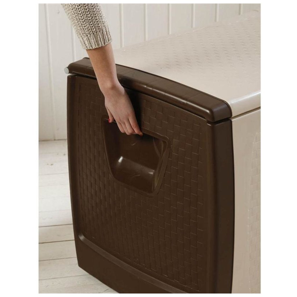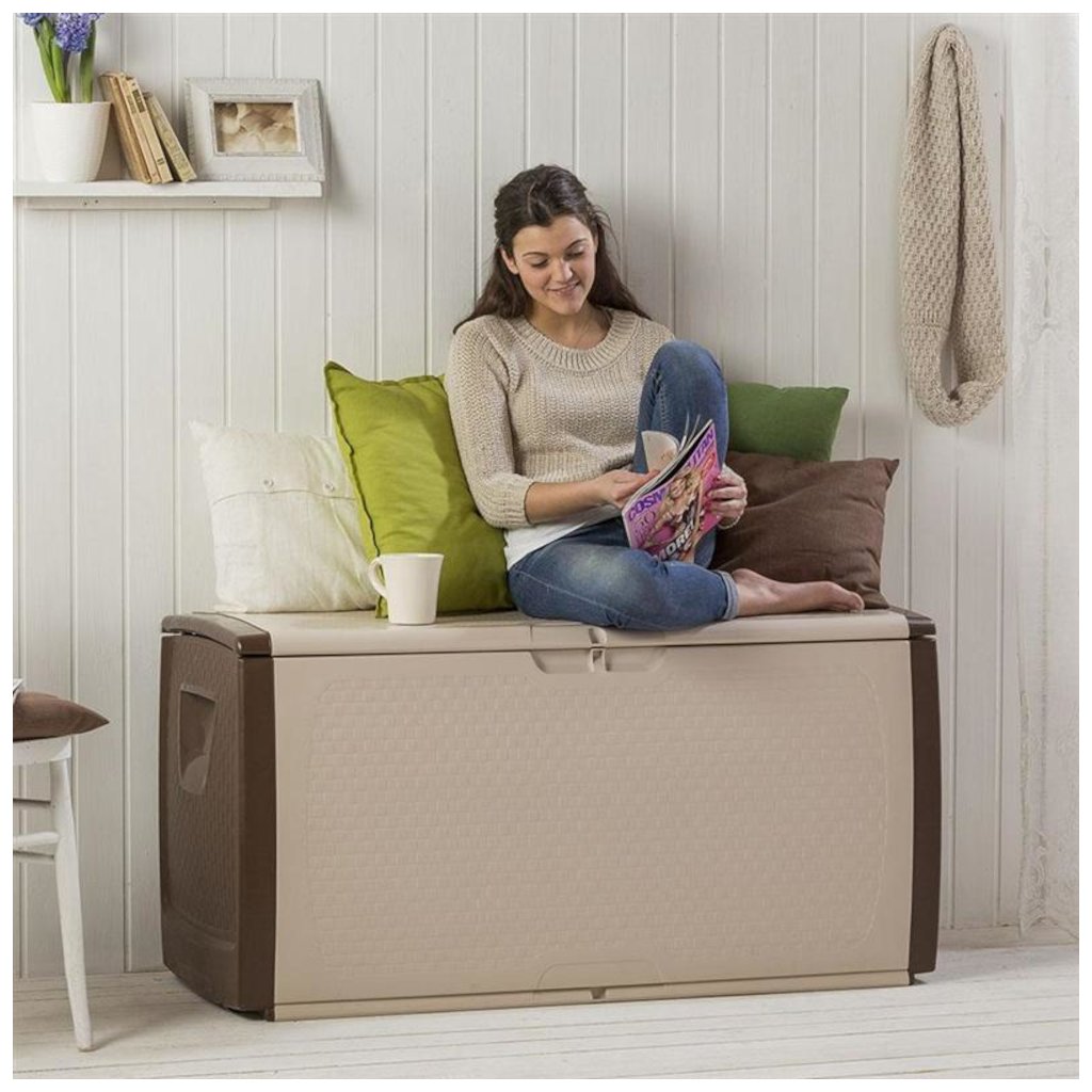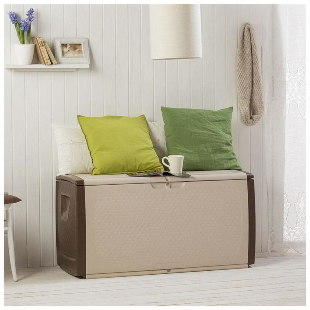 Kiválóan alkalmas nagy párnák, ülőpárnák, kerti eszközök, medence tartozékok vagy játékok tárolására. Elegáns rattan dizájnjának köszönhetően a belső térben is használható bútorként takarók, ágyneműk és egyéb, a szekrénybe nem férő dolgok tárolására. Kényelmes ülőhelyet is biztosít.