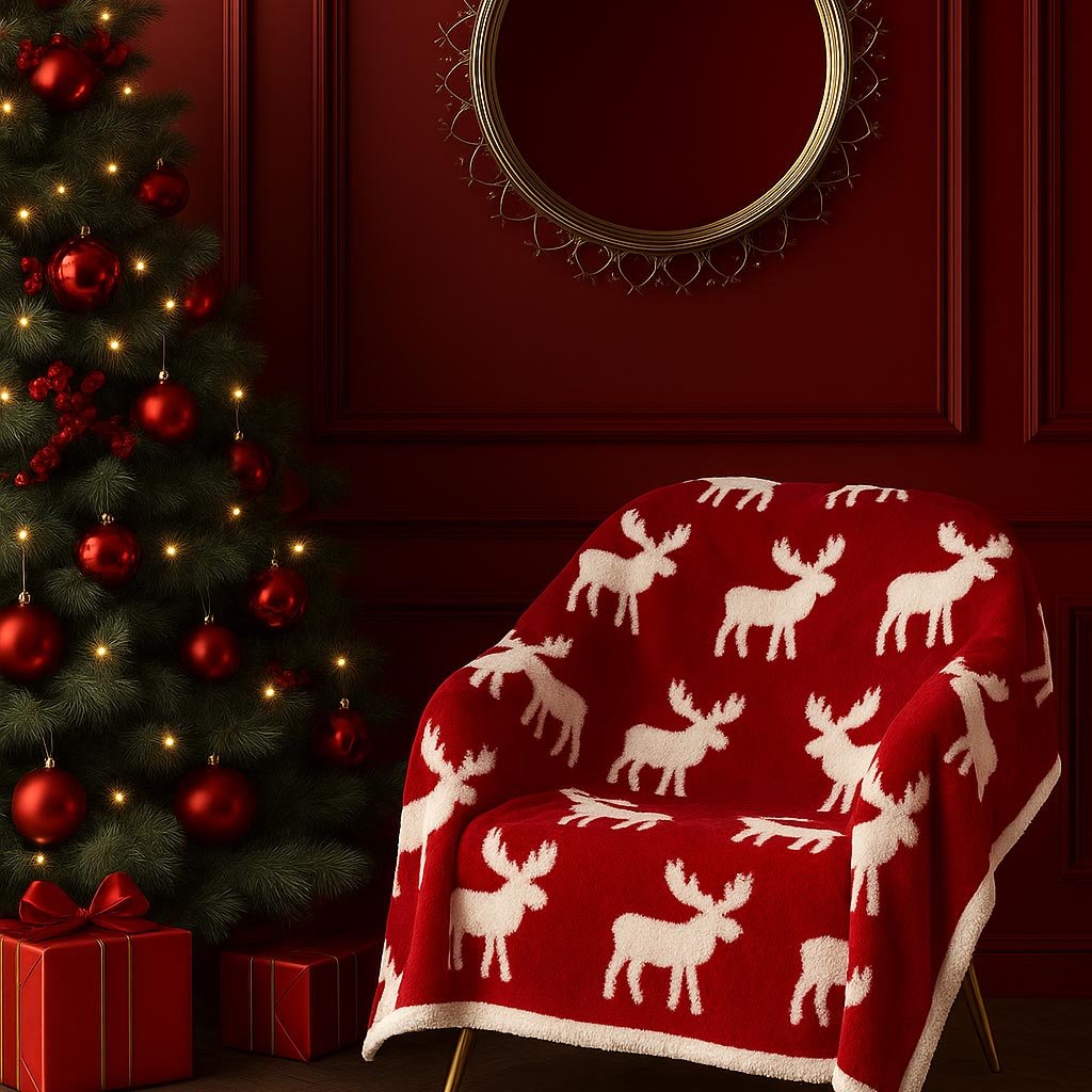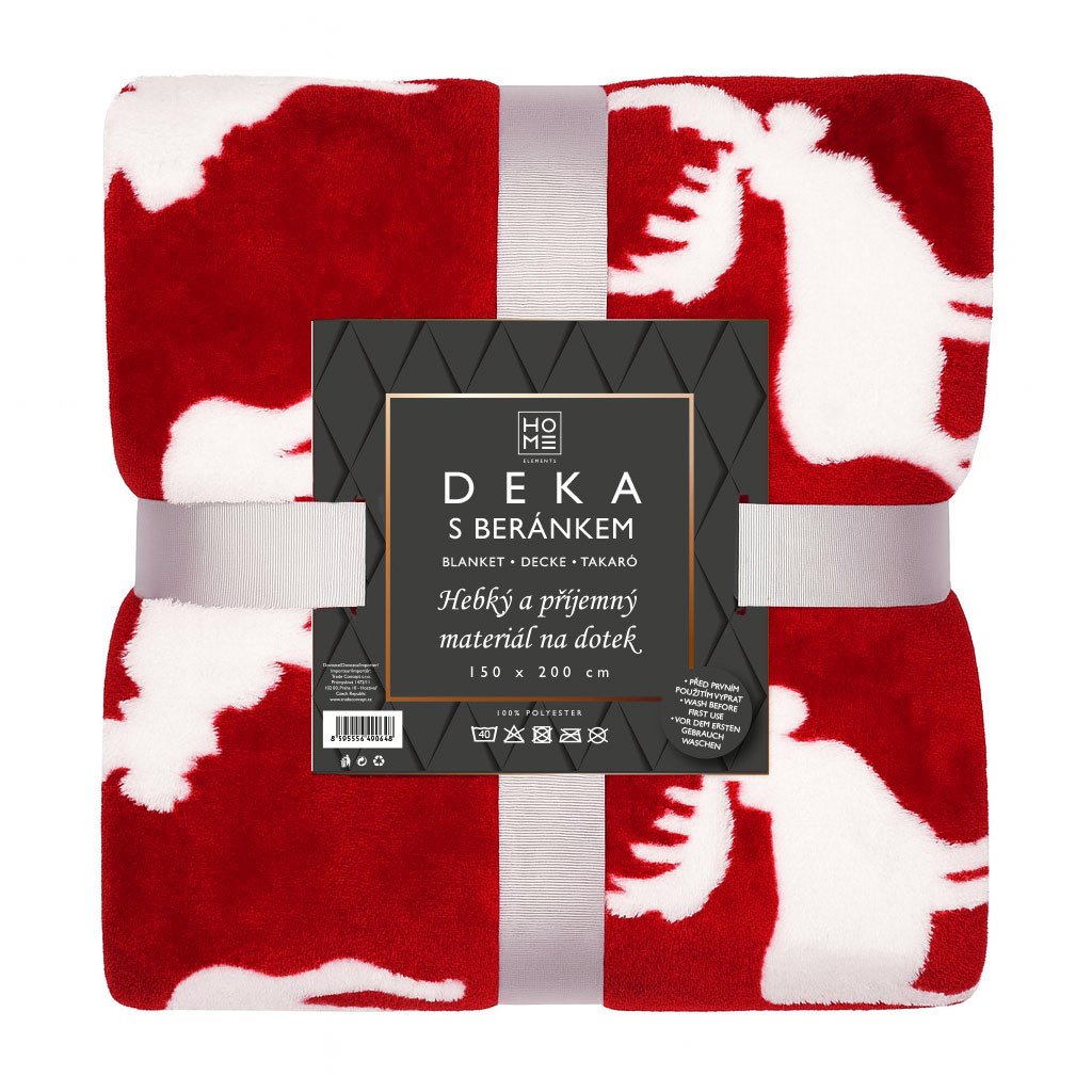 A báránybőrrel ellátott meleg és puha takaró minden háztartásba illik kiegészítőként, és nélkülözhetetlen a hidegebb időszakban. Felmelegít és hozzájárul a kényelméhez. A takaró piros alapon fehér jávorszarvasokból álló jacquard mintával rendelkezik. A báránybőr fehér színű.