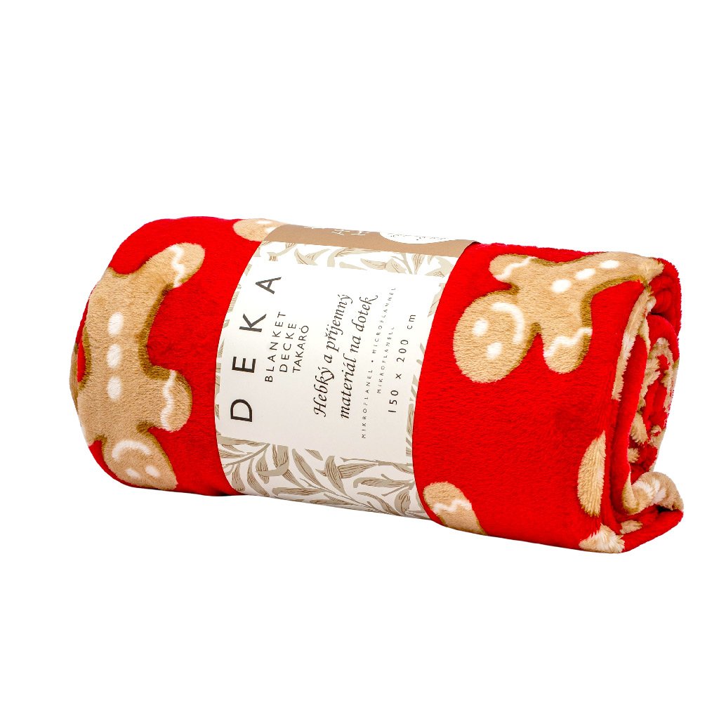 Varázsolja be otthonába a karácsony varázsát ezzel a puha takaróval, melyet vidám mézeskalács minta díszít piros színben. Ideális a téli estékre, amikor hangulatos légkört szeretne teremteni, és felmelegedni mesenézés vagy családi összejövetel közben.