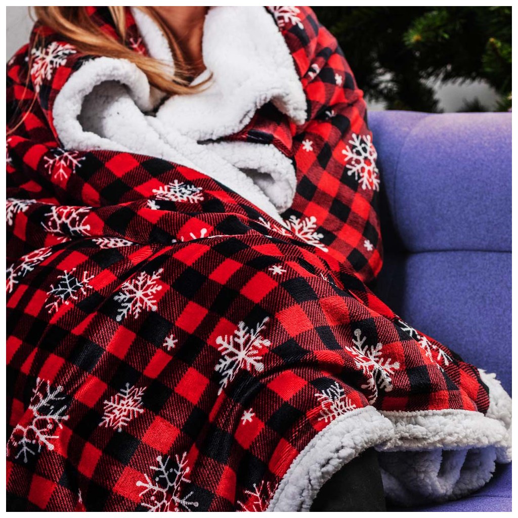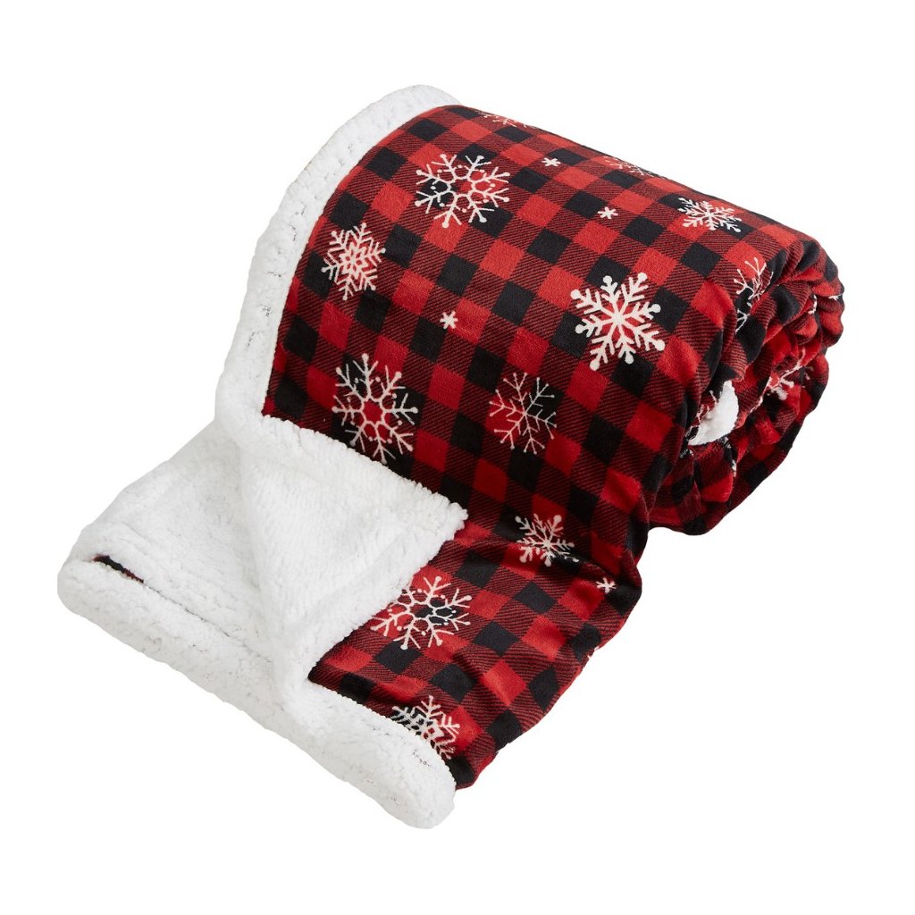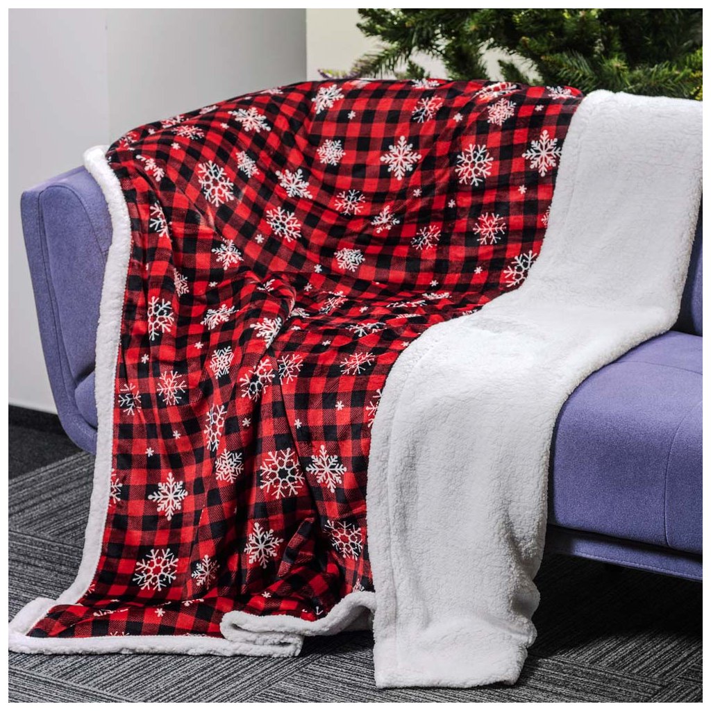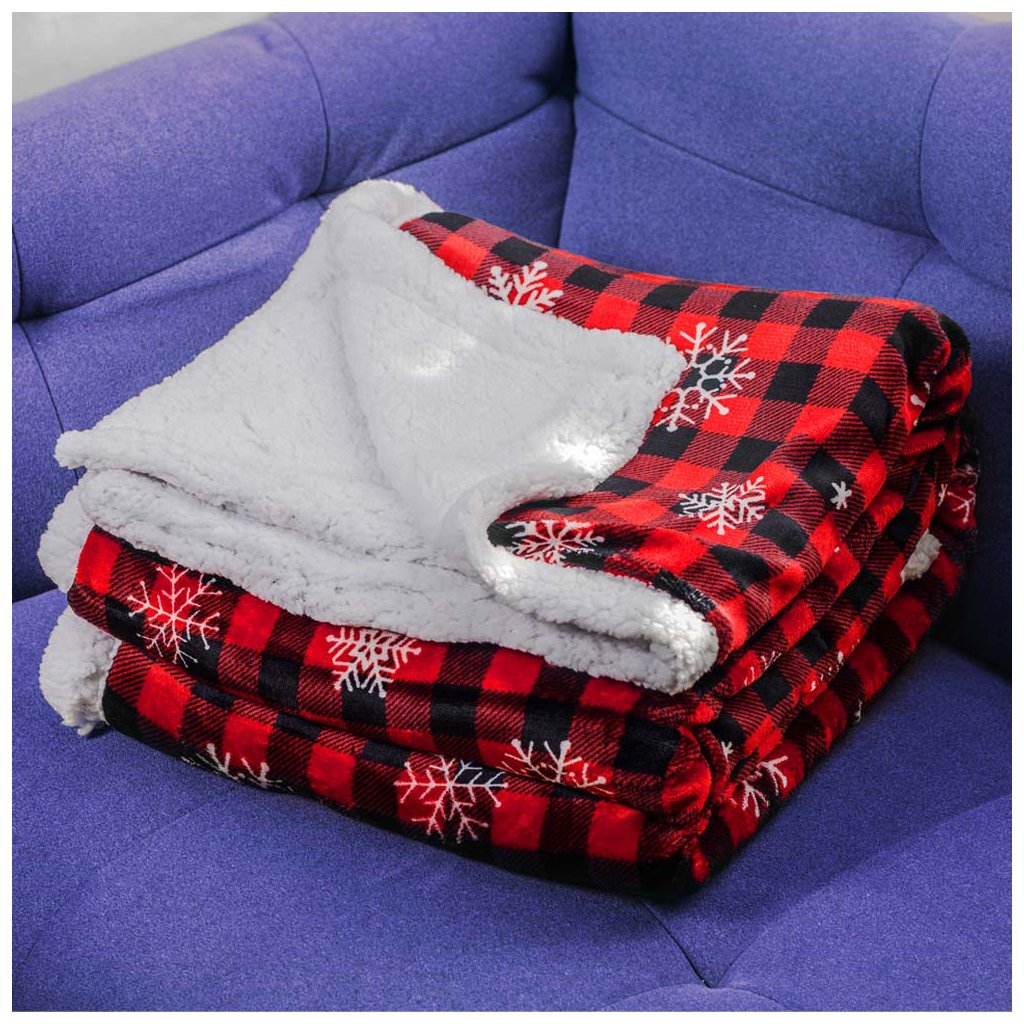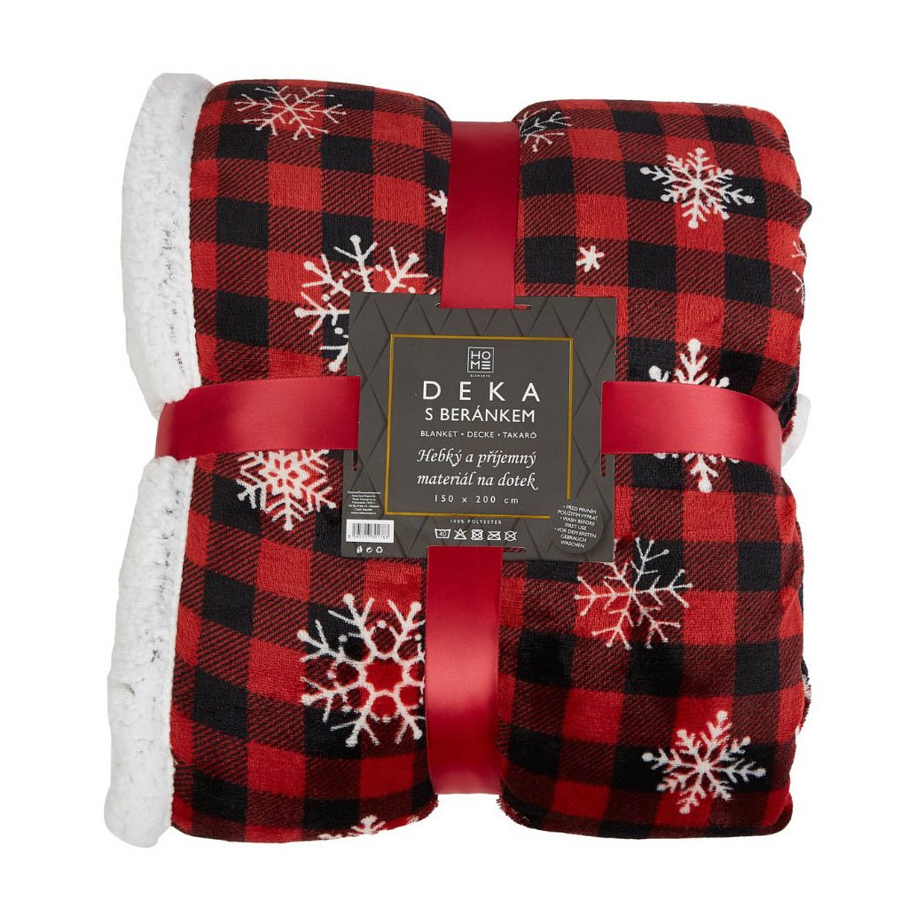 Mikroflanel takaró báránybőr hatással, Kockás mintával, hópihékkel, piros Home Elements